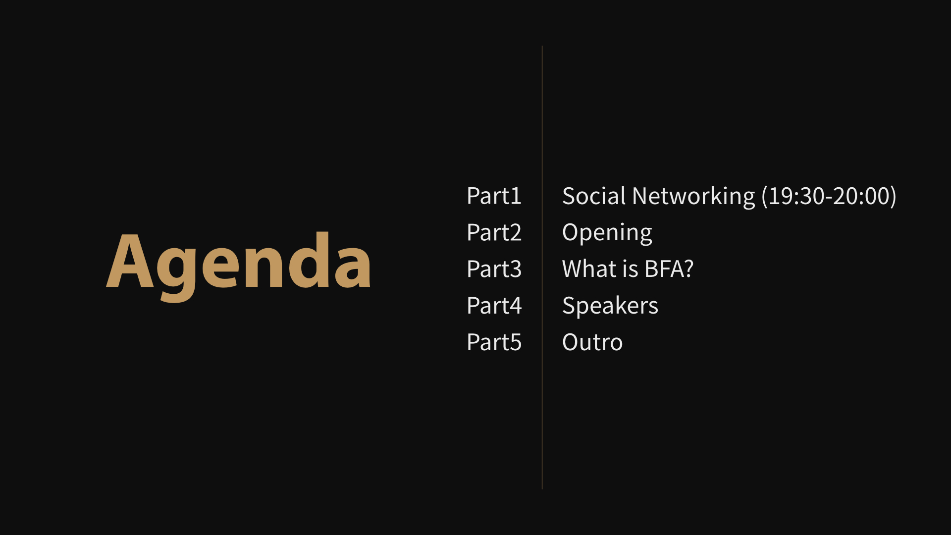 承襲 BFA 簡報小聚交流互動與分享的精神,每次聚會由「主題分享」與「自由交流」兩個環節組成。「主題分享」將由三位講者(Before, After, Pro Speaker)依次帶來 12 分鐘的英文簡報溝通故事、經驗或技巧分享。