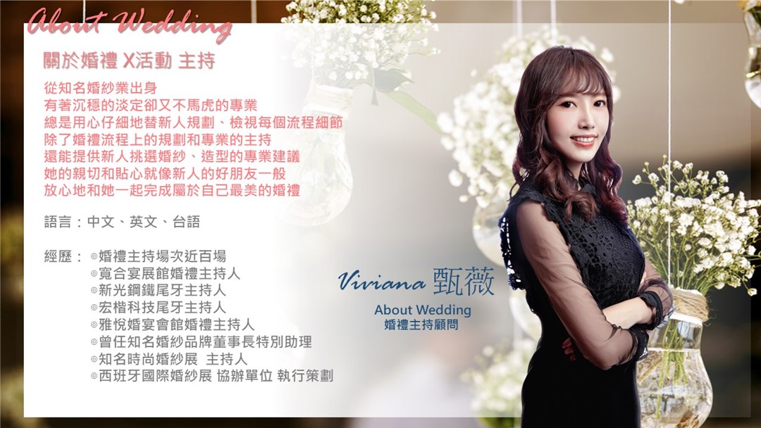 ※ Viviana 從知名的婚紗品牌轉戰婚禮企劃,目前已執行過上百場婚禮,細心提供專業的建議,是新人絕對信任的婚禮顧問。