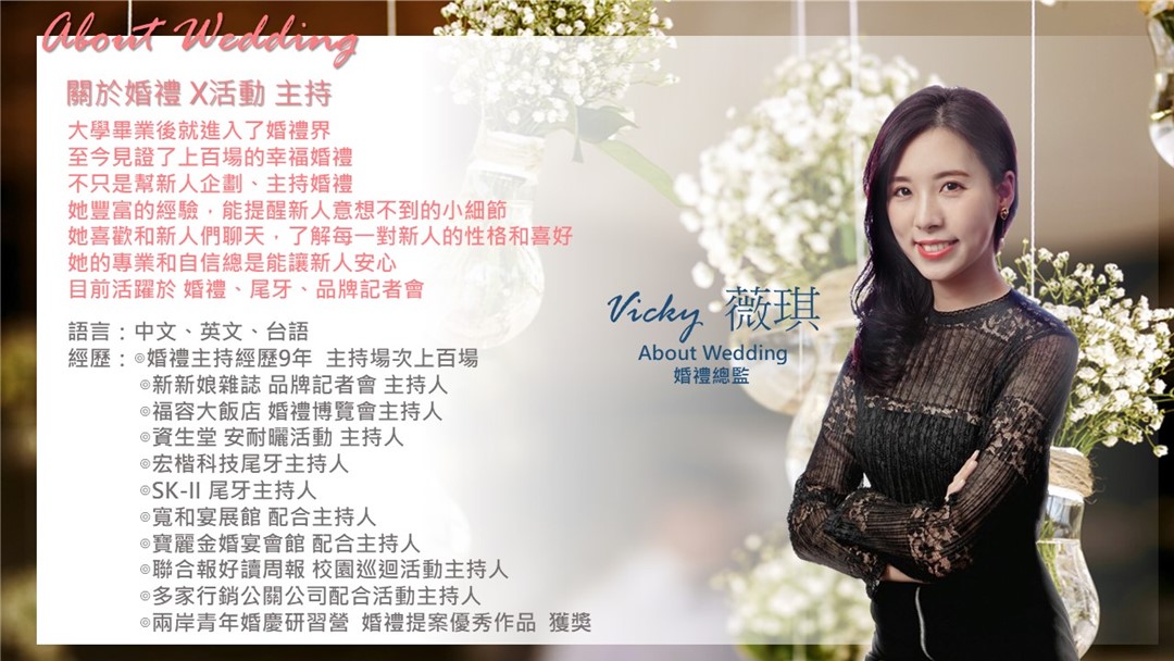 ※ Vicky 總監從一畢業就投入婚禮產業,從知名婚宴會館婚禮企劃出身,累積超過800場、近十年的主持經驗。
