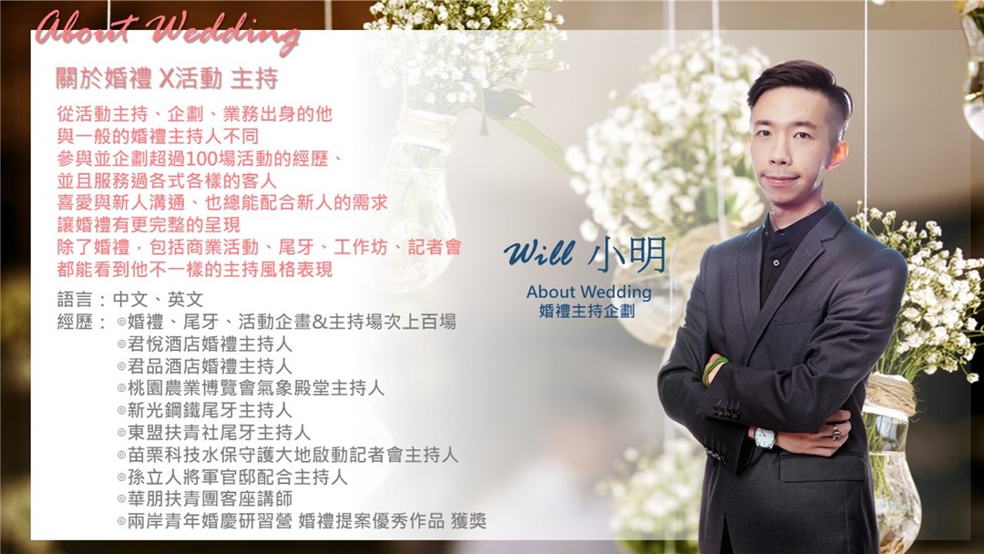 ※ 小明從活動主持出身,一開始沒有任何的婚禮主持經驗、直至現在憑著他的認真與個人特色,已獲得多對新人對其專業能力的大力肯定。