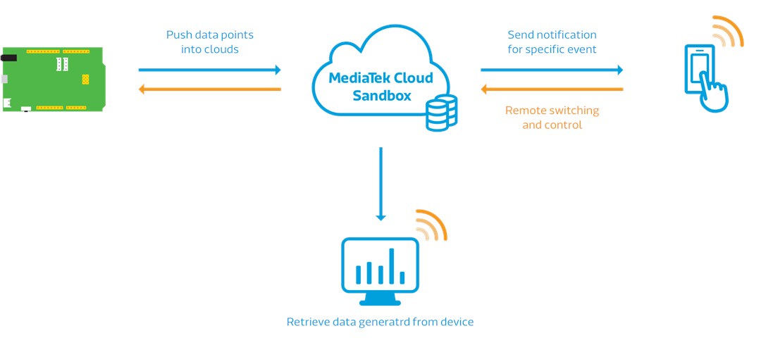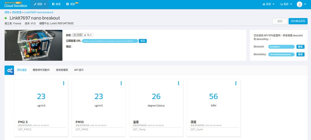 註冊並學習如何設定使用MCS(MediaTek Cloud Sandbox)服務,讓空氣盒子能將資料拋到MCS上,透過網站與手機APP 即可查看空氣盒子的數值。