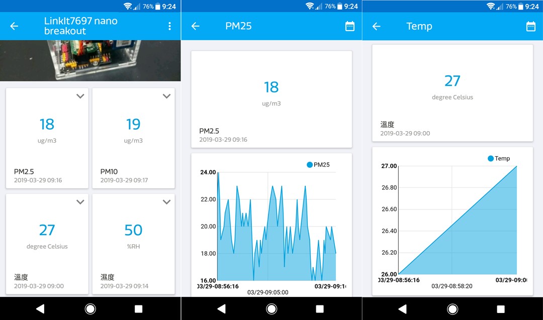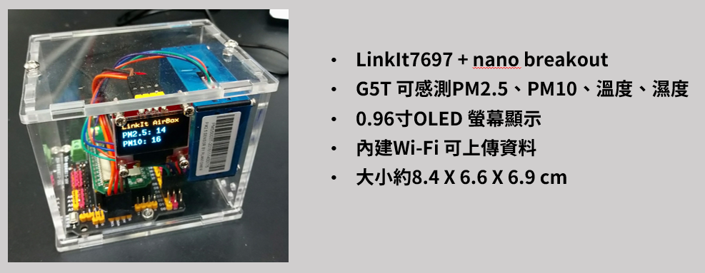 輕鬆使用LinkIt7697 製作空氣盒子,搭配擴充板LinkIt7697 nano breakout,連接環境感測器PMS5003T(G5T),此感測器能感測PM1.0/PM2.5/PM10/溫度與濕度。