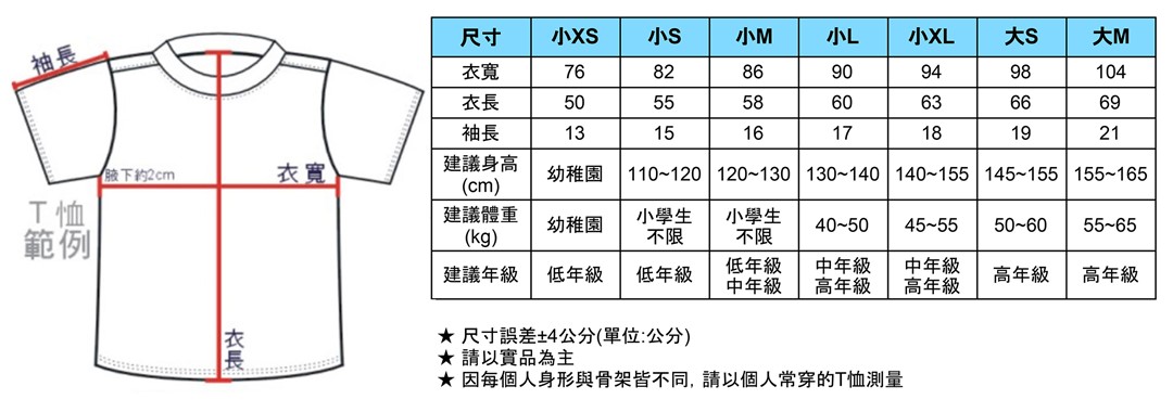 請依照下圖的尺寸表選擇最適合小朋友的衣服尺寸,我們將依照表單中所填尺寸發送(此項為贈品,恕不退換)