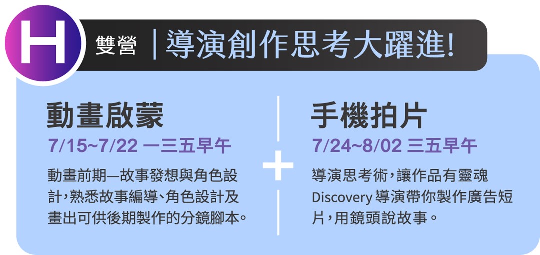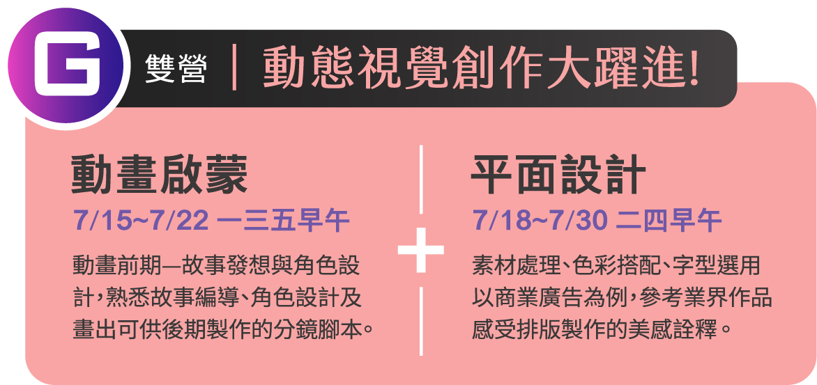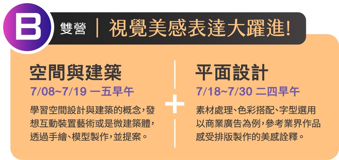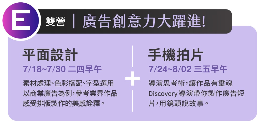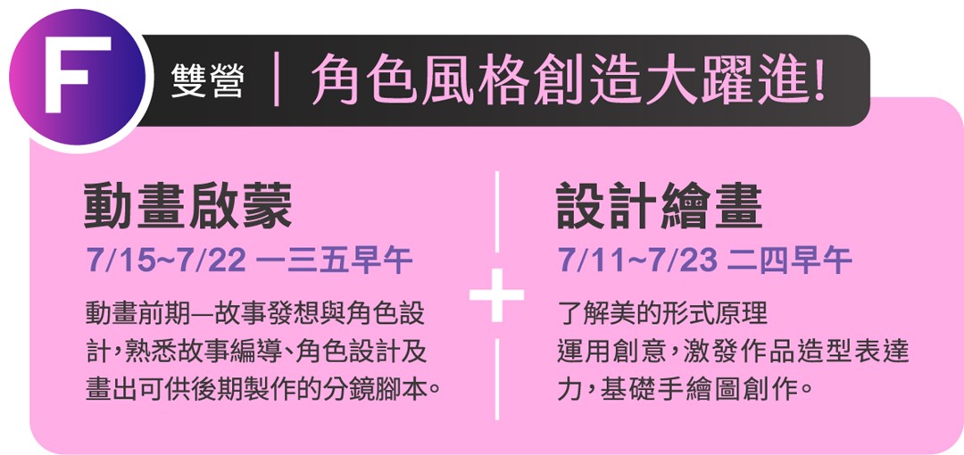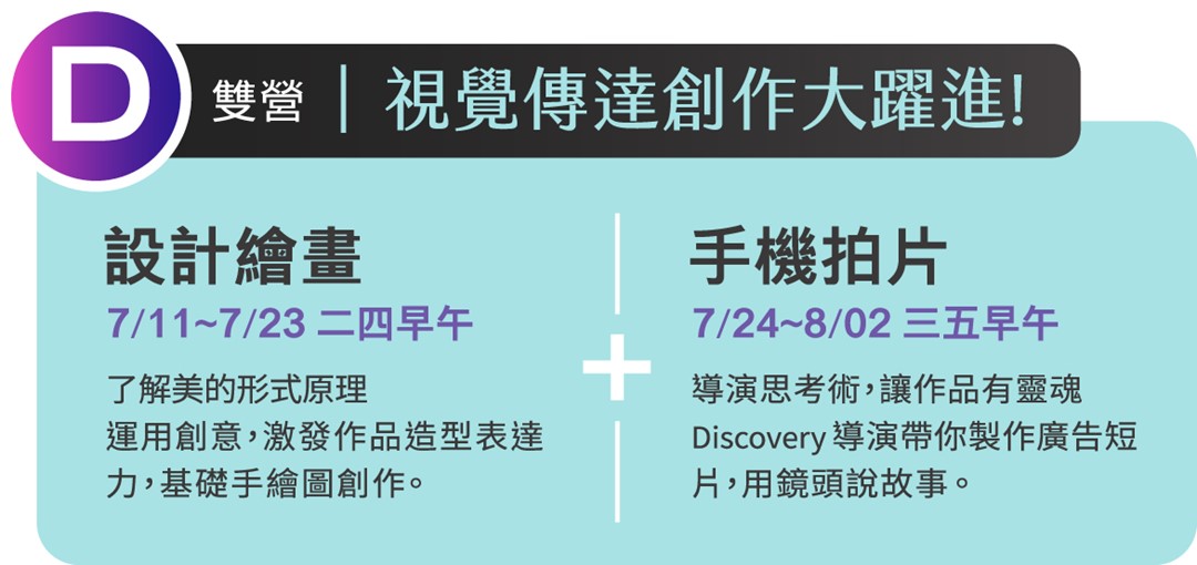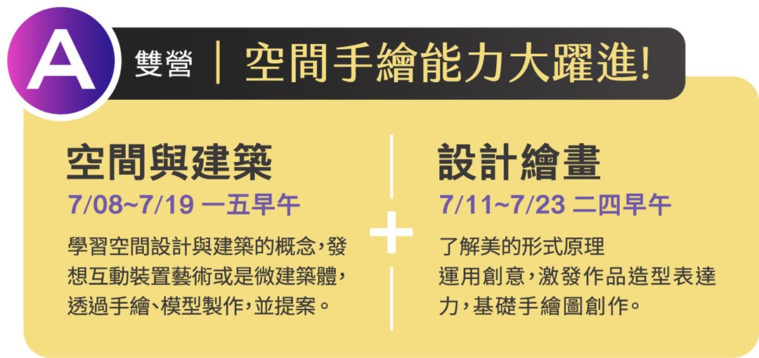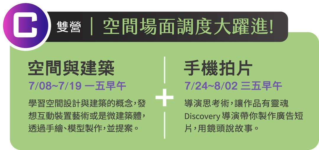 <動畫啟蒙營><平面視覺營><設計繪畫營><空間與建築營><手機拍片營>