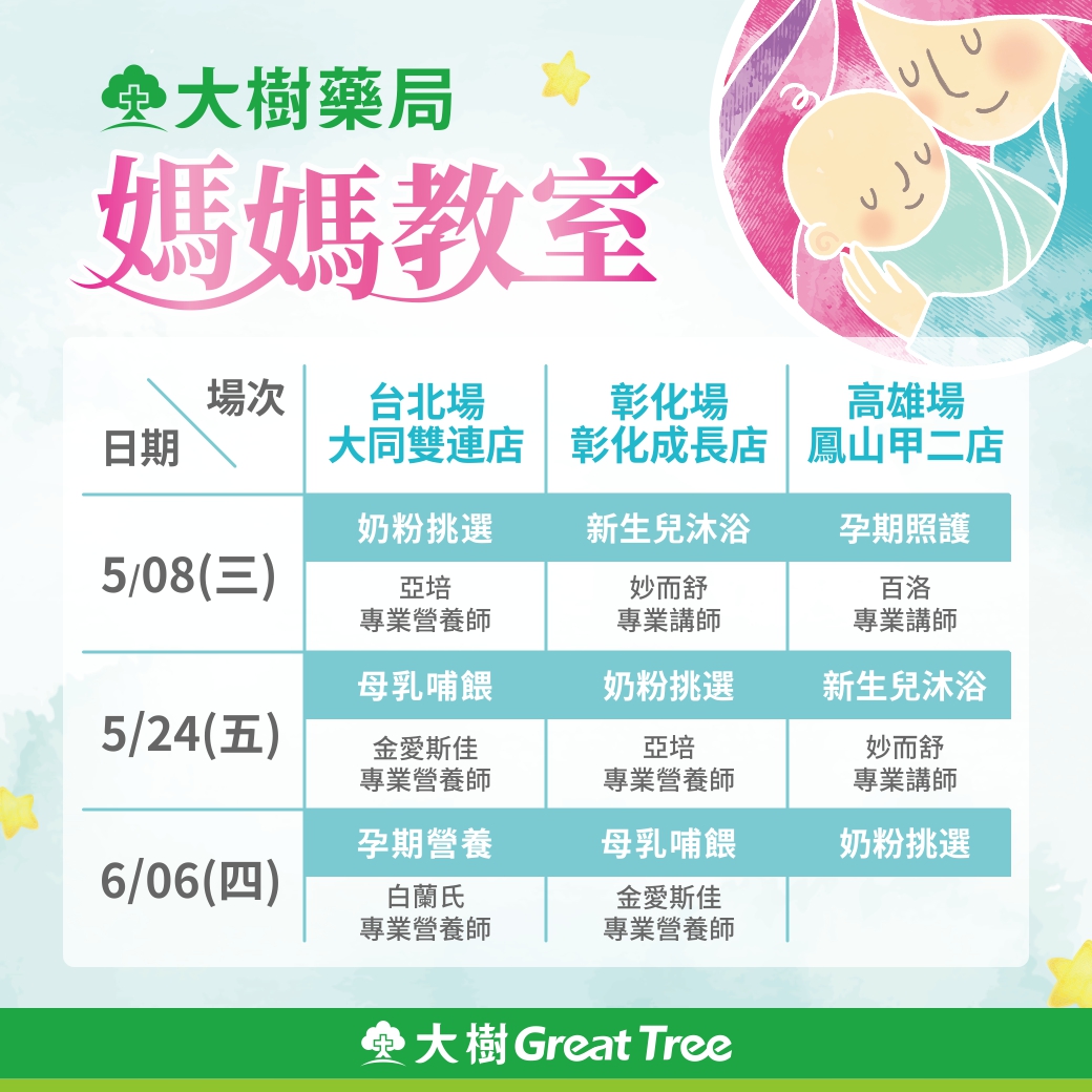 大樹藥局媽媽教室開課囉!由大樹優質且專業的藥師及保母,開辦一系列課程,提供準媽咪正確的孕期衛教和營養補充資訊,更準備了輕鬆有趣的新生兒照護課程, 讓媽咪們下課後,腦袋知識吸收滿滿,手上贈品也滿~滿~滿! 一系列5堂課結業後,更有精美福袋、專屬超值優惠,送給您哦!