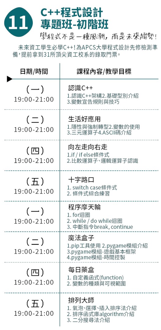 未來資工學生必學C++!提前為APCS大學程式設計先修檢測準備,拿到31所頂尖資工校系的錄取門票。