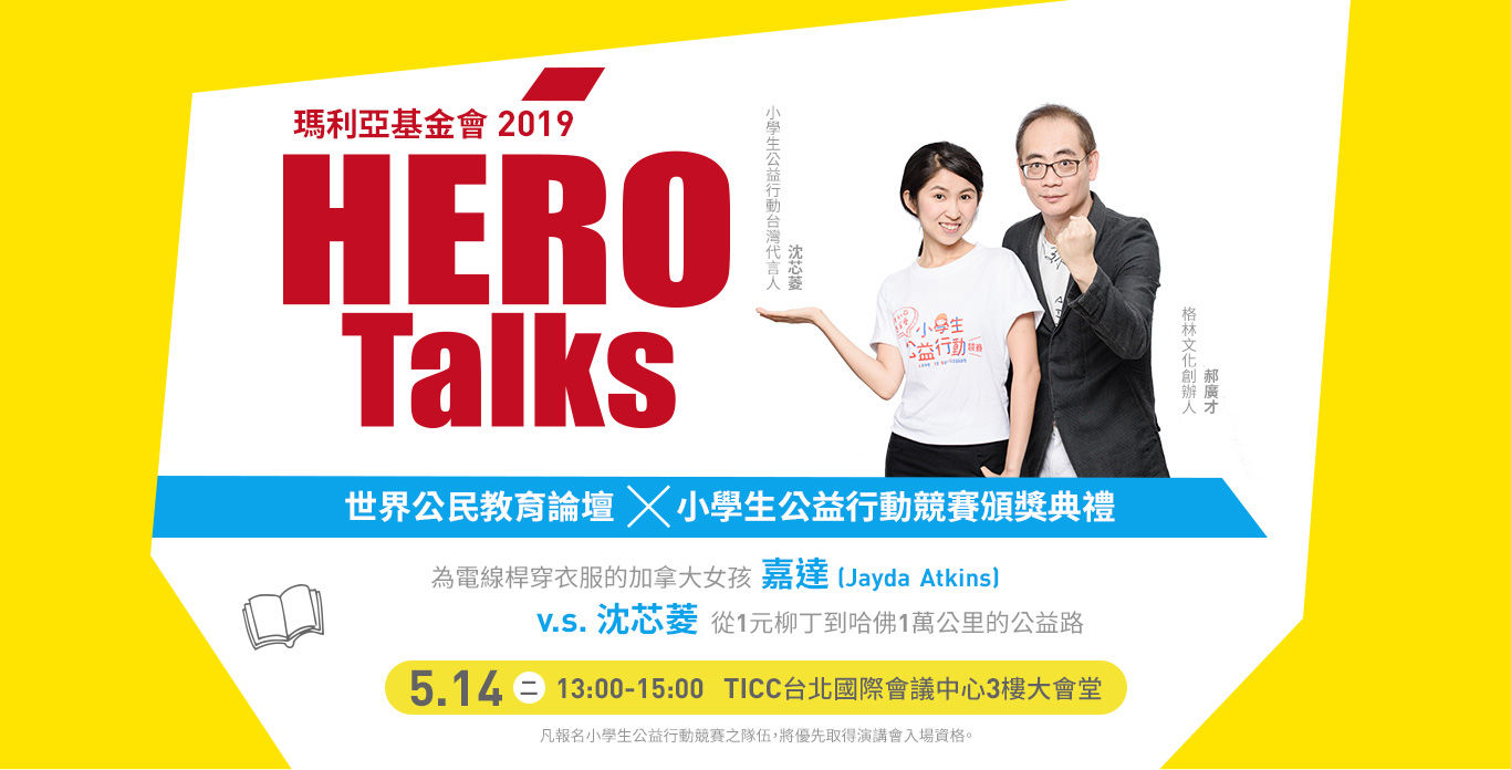 誠摯邀請師長帶著學生走出教室,一同來到「HERO Talks 世界公民教育論壇」,透過兩位公益大使–嘉達及沈芯菱的故事分享,讓與會者了解「只要你想,小學生也可以成為英雄,不用等到長大」!