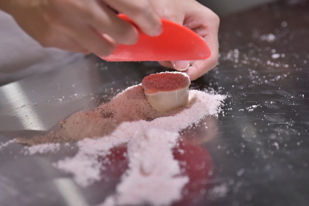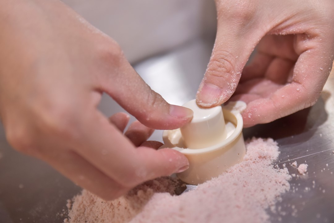 老師示範糕料製作,讓課程學員體驗糕粉過篩、壓模成形