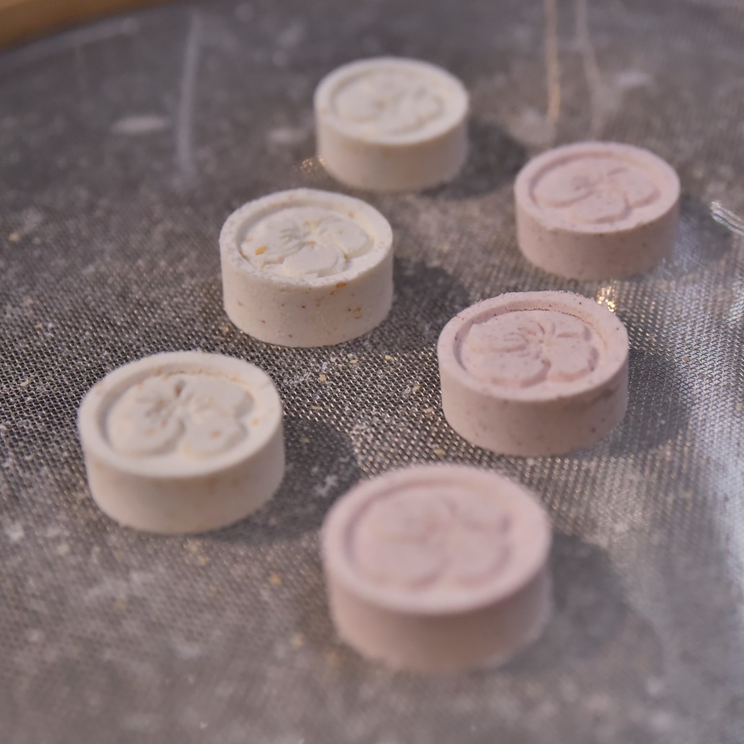 以梅子入味研磨成綿滑細緻糕料後壓製成模,