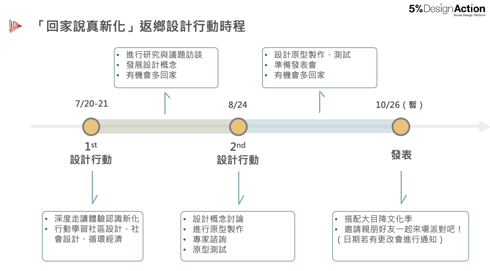 鼓勵在外地打拼的設計師透過返鄉設計行動,組成6組跨領域團隊,並串聯起新化在地與台南的公、私部門,進行約三個月的走讀體驗與共創工作坊,以新的角度認識新化,深入新化的議題,透過社會設計共創,提供新化發展更多元的創意與嘗試,成果將與山海屯社會企業的「大目降文化季」搭配共同呈現。