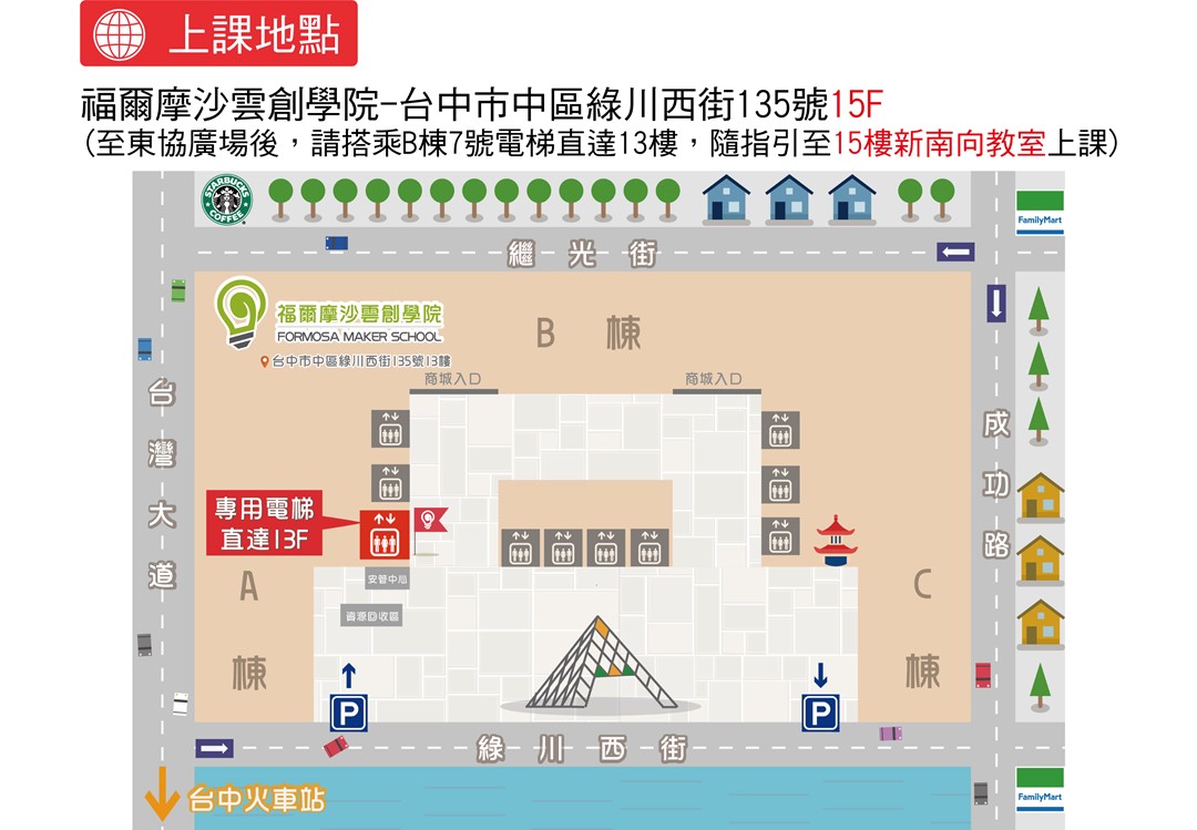 福爾摩沙雲創學院-至東協廣場後,請搭乘B棟7號電梯直達13樓,至15樓新南向教室