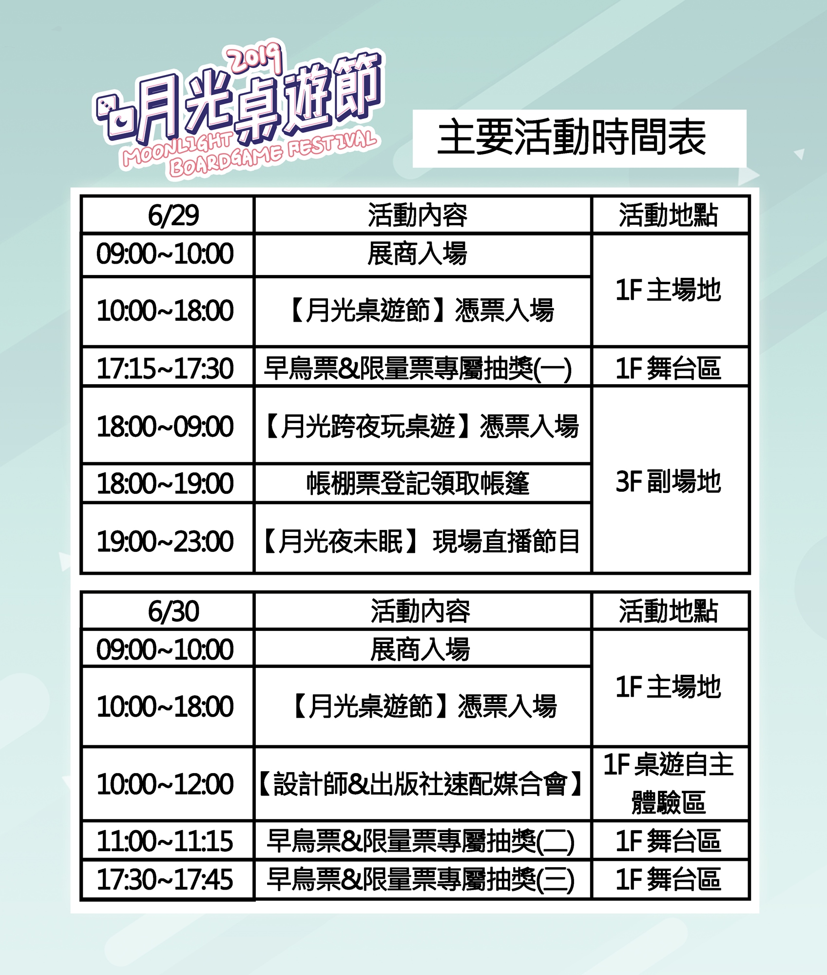 覺得在活動上逛了一天還玩不夠過癮嗎?由6/29晚上開始直到隔天早上,跨夜的桌遊活動是月光桌遊節期間的一大特色,6/29下午18:00開始將於3樓的副場地開放憑票入場玩桌遊,直到隔天早上9:00,現場同時會有許多由參展商提供的最新遊戲,當然也可以自己帶遊戲過來,趕快找自己的親朋好友來一次玩個夠!也可以購買帳篷票提高跨夜活動的氣氛喔~