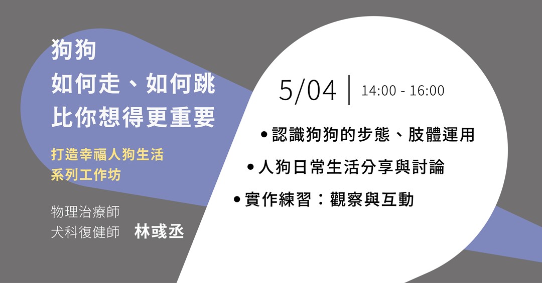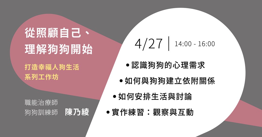 想幫助狗狗生活得更快樂,卻不知道怎麼做嗎?想跟狗狗建立好關係,卻總是遭遇問題搞得身心俱疲?想知道狗狗在跟我們說什麼嗎?汪事屋這次邀請到職能治療師,同時也是狗狗訓練師的健將麻(陳乃綾),帶領大家討論、實作與觀察,幫助大家找到屬於自己與狗狗的幸福生活。