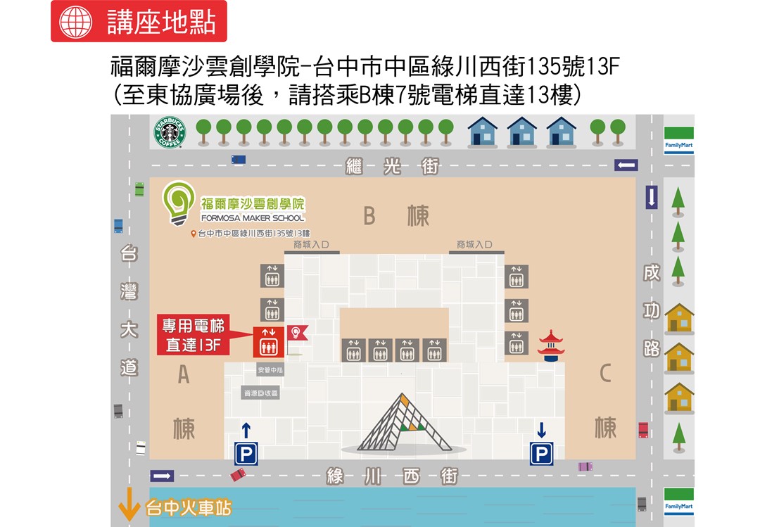 福爾摩沙雲創學院-至東協廣場後,請搭乘B棟7號電梯直達13樓