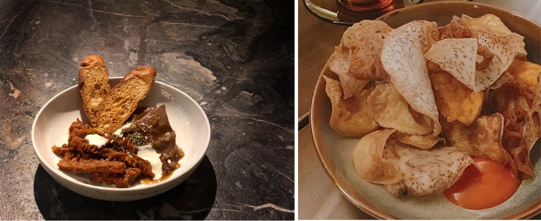 慢燉雙拼: 燉豬舌(黑蒜頭/大馬告豚濃汁)+義式燉牛肚(法國白起司/番茄醬汁)