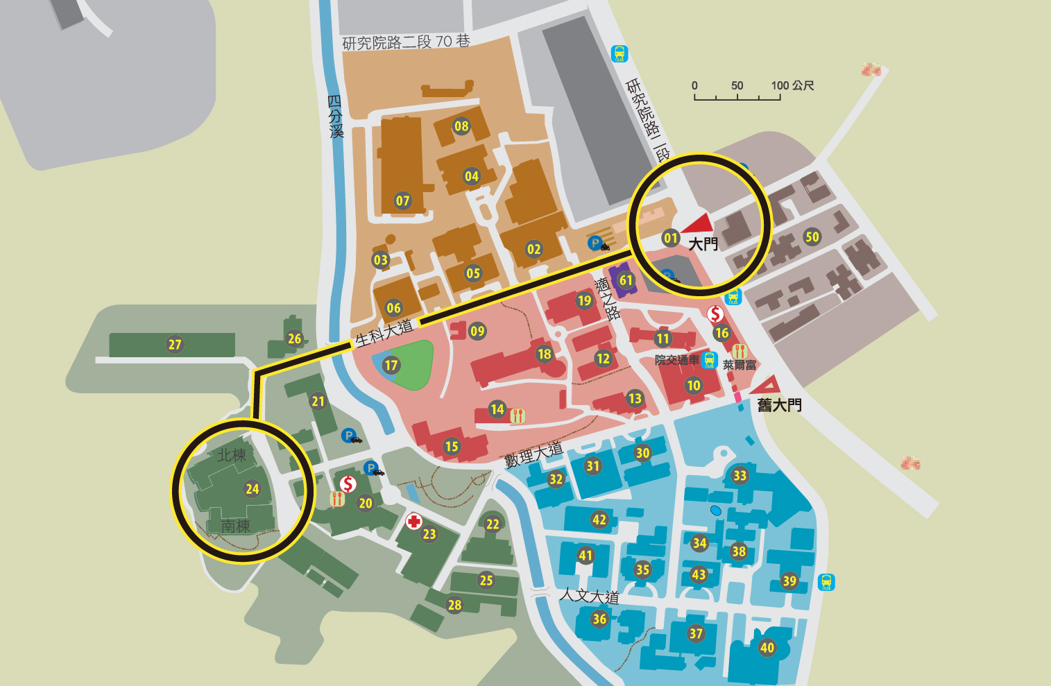 - 至南港展覽館站5號出口對面換乘公車: 212、 276、 306、 620、 645、 679、 205、 小5、 小1、 小12 (中研院站)