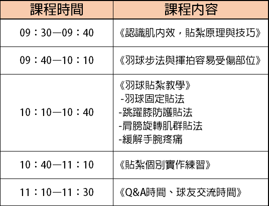 講師會現場示範貼紮,請各位羽球人穿著輕便運動服裝來上課喔!以利講師協助貼紮
