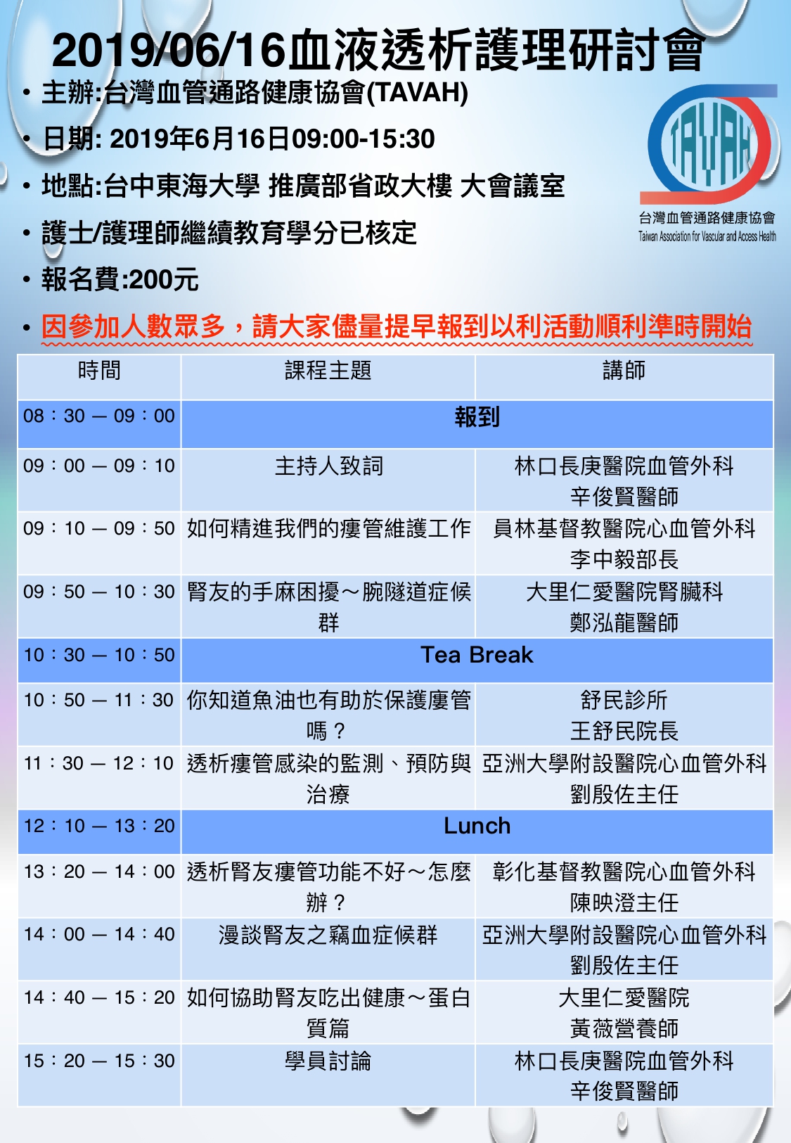 親愛的護理姐妹們,6/16 08:30~15:30 我們將於東海大學 推廣部省政(研究)大樓會議廳 舉辦我就要你順順的~2019血液透析通路研討會-台中趴 !!! 妳不要只是心動,快快加入我們的行列,讓我們一起為腎友的第二生命線繼續努力。