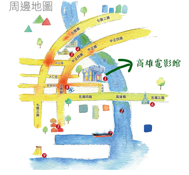五福幹線、建國幹線下車後於新樂街向東,往愛河方向步行五分鐘即可到達。