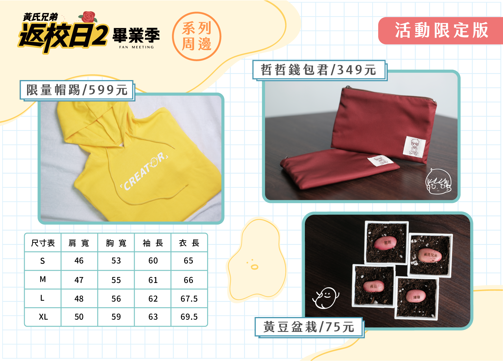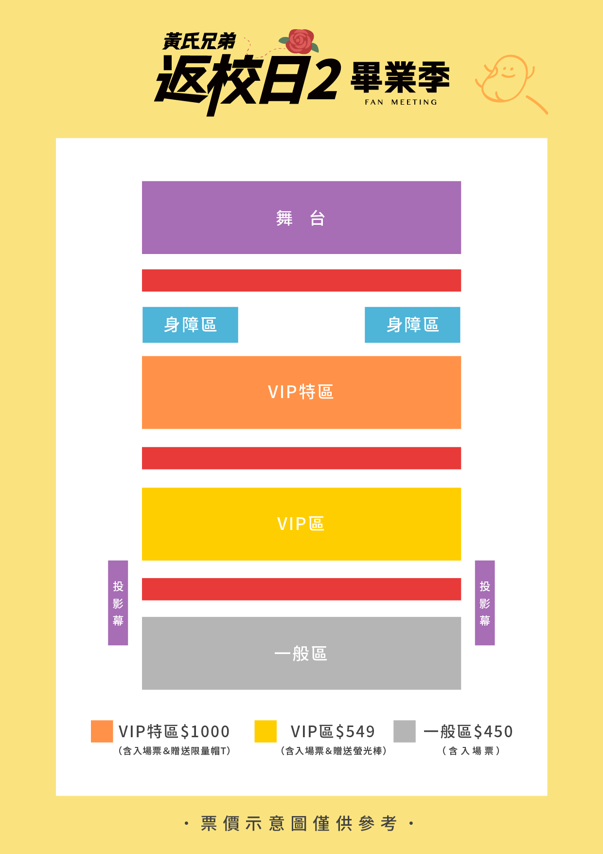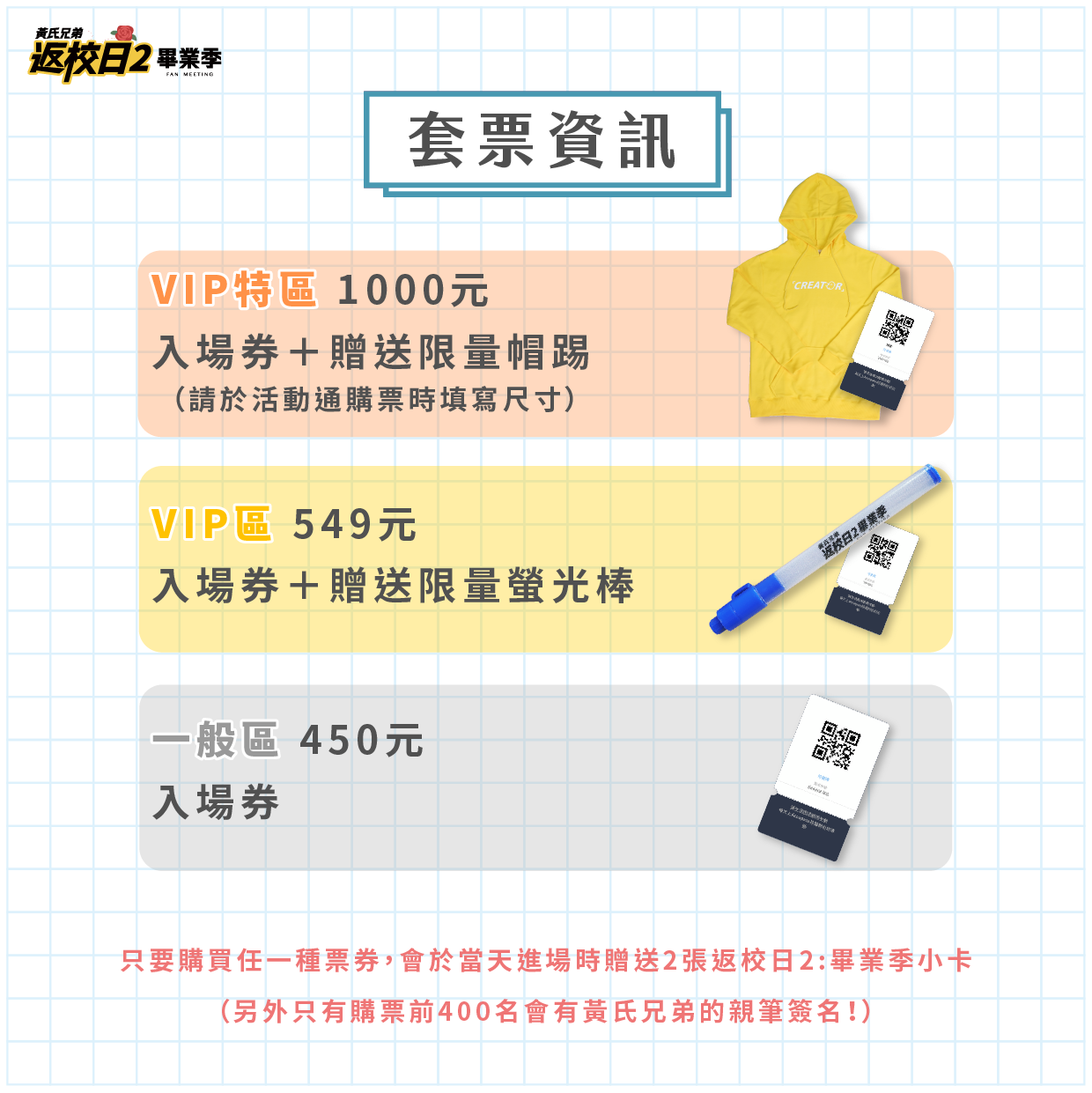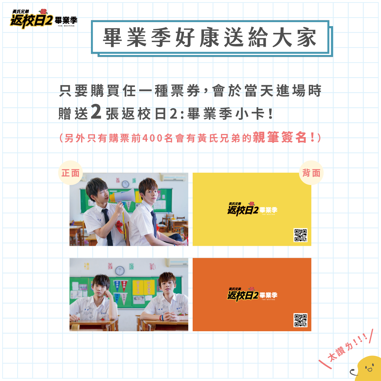 👉只要購買任一種票券,會於當天進場時贈送2張返校日2:畢業季小卡 (另外只有購票前400名會有黃氏兄弟的親筆簽名!)