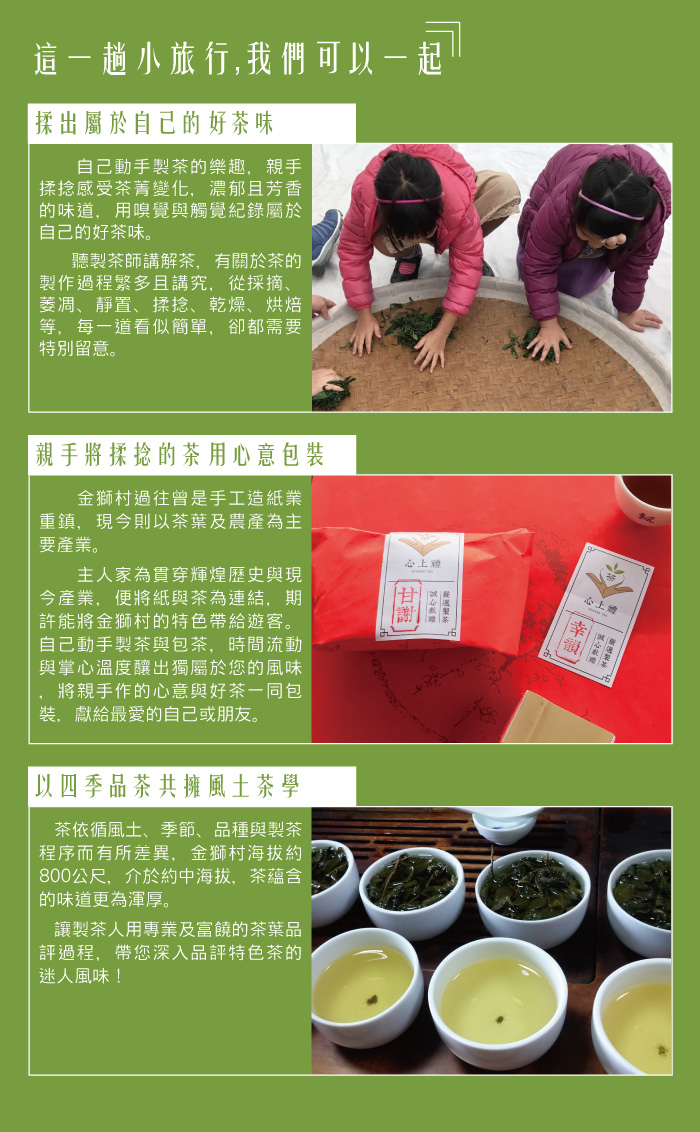 活動:手作揉茶體驗、手包茶心體驗、風土茶學品茗趣。