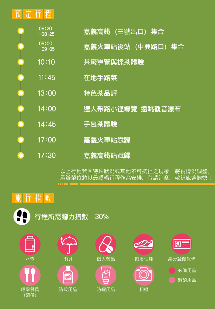 交通:本活動包含中型巴士接送,於嘉義火車站與嘉義高鐵站上下車。