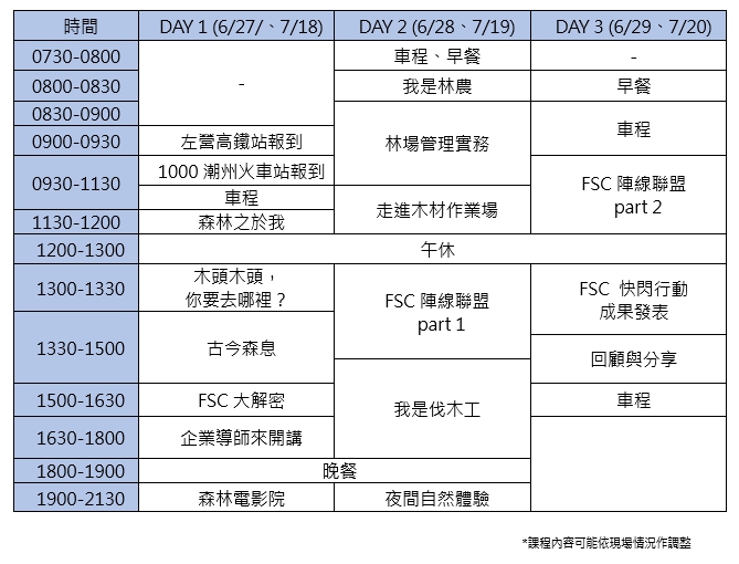 - 此工作坊非團康型營隊,並安排許多戶外體驗及林業實作課程,為避免造成期望落差,請審慎考量個人需求。
