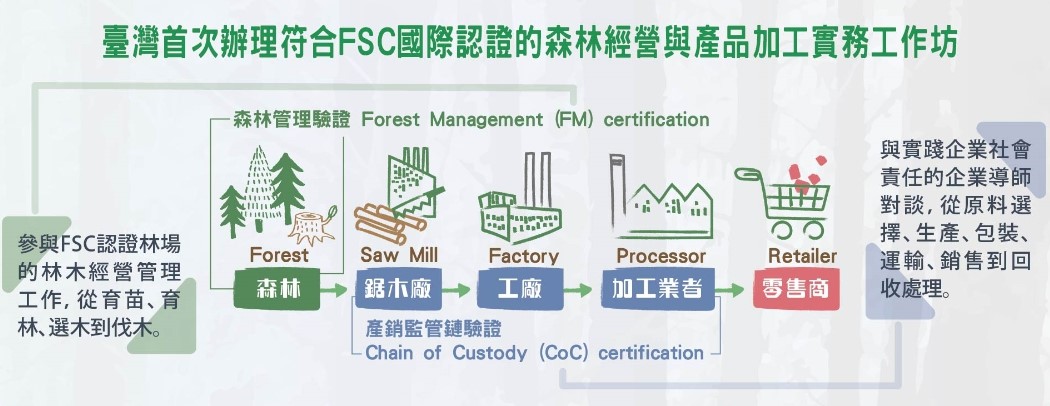 您將參與的是臺灣首次辦理符合FSC國際認證的森林經營與產品加工實務工作坊,從林木生產端的森林經營驗證「FM」到生產製造利用端的產銷監管鏈驗證「CoC」,您將親自參與林場的林木經營管理工作,從育苗、育林、選木到伐木,您將與企業導師對談,從原料選擇、生產、包裝、運輸、銷售到回收處理。透過完整參與FSC驗證流程,讓您體認為FSC友善環境的價值。