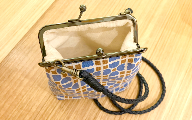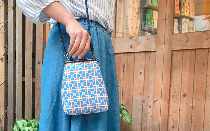 復古又實用的散步隨身口金包,選用印花樂250g棉質布料製作,搭配側背皮革編織繩,是在春暖花開之際出遊的最佳小包。