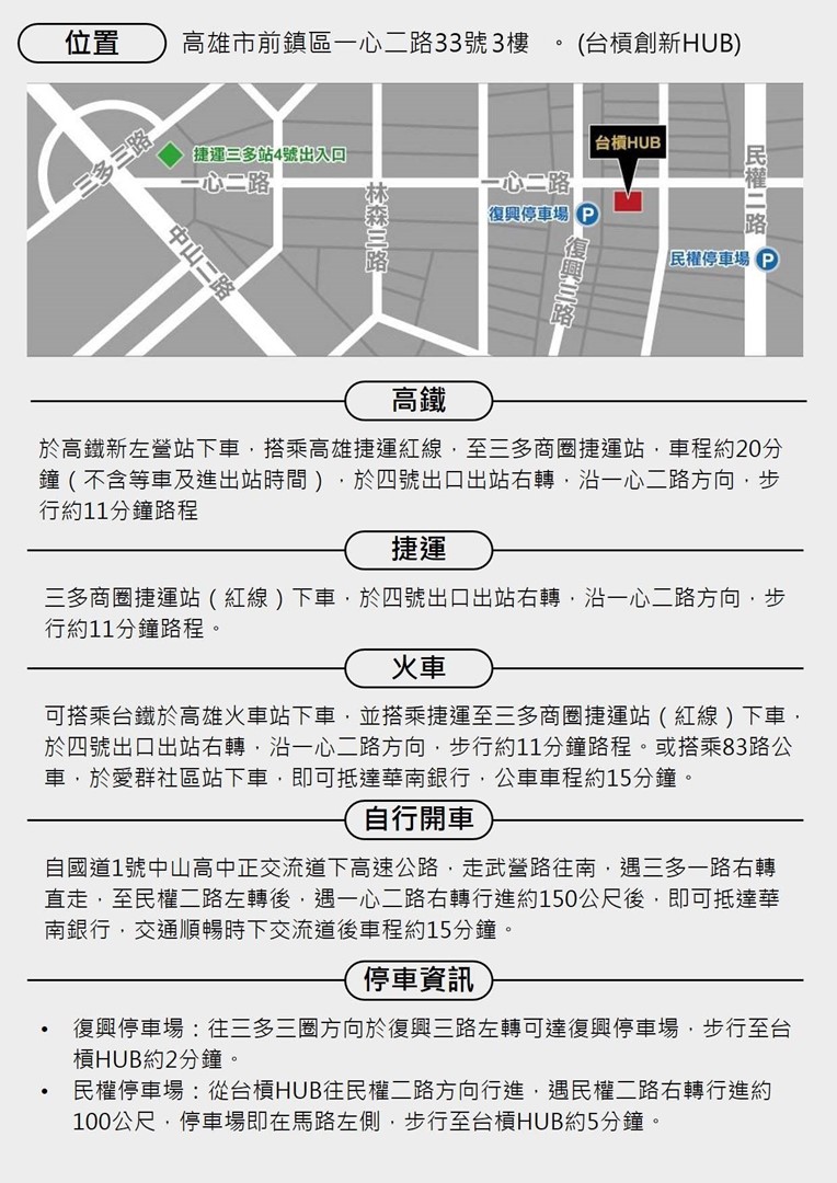 • 位置:高雄市前鎮區一心二路33號3樓。(台槓創新HUB)