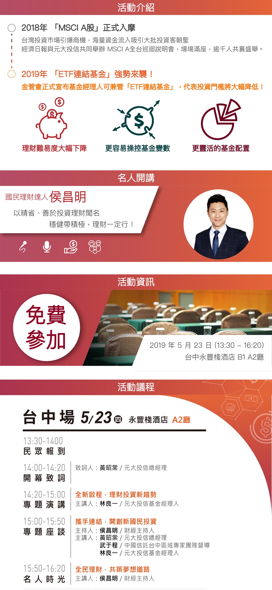 - 非會員報名的個資使用聲明:報名本活動即知悉並同意主辦單位及元大投信為提供活動訊息相關服務及行銷宣傳目的,得於本活動期間與結束後三年內蒐集、處理及利用您的個資,利用方式包含電話行銷、eMail訊息、簡訊、傳單等。