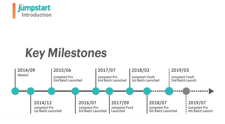 Jumpstart Global 是由青年創建的非營利組織,我們的願景是 #為組織培育具備創新創業精神的領袖。2014年由三位創辦人共同創辦,以系統化的方式,協助青年探索人生願景及培養關鍵競爭能力。期望培育更多台灣優秀青年擁有願景及創業家精神,並成為新創、成長型企業和跨國公司新事業的領導人才。Jumpstart Global Pro 計畫自 2014 年創立以來,報名人數超過 1000多名,五屆計畫以來,共錄取及培養超過 100 位校友。有接近 20% 的校友率取全球頂尖商學院。包含 Stanford (GSB), MIT (Sloan), UPenn (Wharton), UC Berkeley (Haas), Columbia (CBS), Cornell (Johnson), Northwestern (Kellogg), INSEAD, IMD...等。 80% 校友任職於跨國公司的新事業團隊 (如 Google,IBM,LINE,Amazon,Uber,McKinsey,BCG,APT...等);新創及成長型公司 (如 Appier,KKBOX,Cobinhood,RedPeak,WeWork,綠藤生機,商湯科技...等。) 擔任要職或是自行創業。團隊更於2018年啟動 Jumpstart Global Youth 計畫,為近150位即將畢業的學生提供職涯規劃建議、導師計畫,期望從更早期開始進行人才培育、孕育更多未來領袖。
