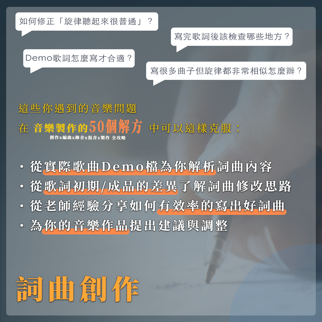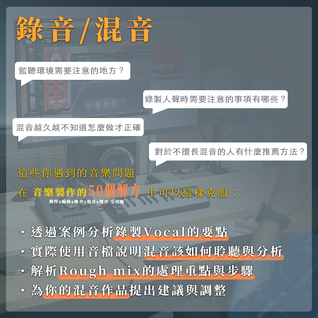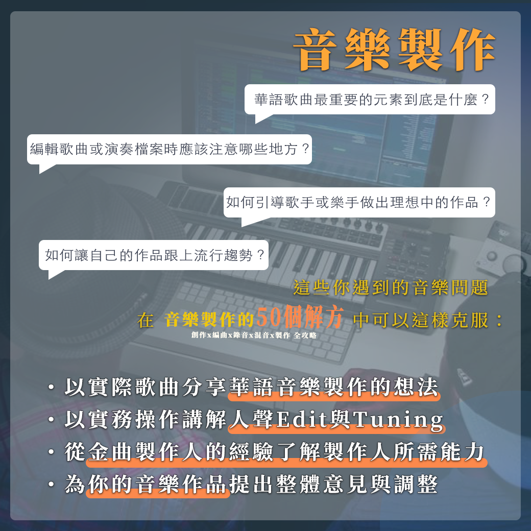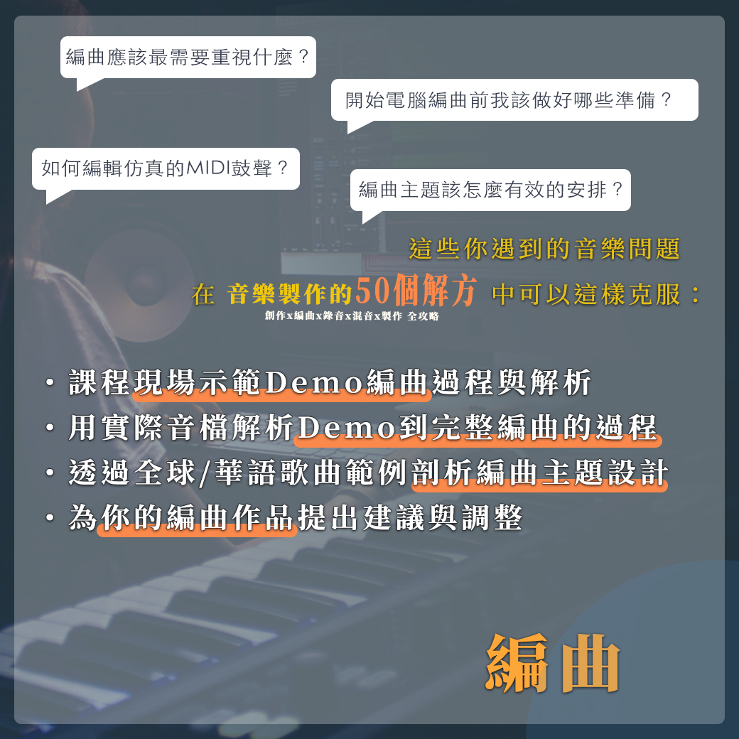 「我投稿的音樂作品都沒消息,怎麼樣才會被採用?」「從事音樂多年都沒有任何成果該怎麼辦?」想把音樂做好、持續前進的你遇到音樂技術或心理狀態的難關是不是無法克服、甚至想要放棄?「比你聰明的人阿 都在努力往前 我無力的閉上眼」 -老王樂隊《那些失眠的夜裡難以忘懷的事》如果你想突破瓶頸做好音樂就來這裡讓自己變得更強吧!針對音樂創作、編曲、錄音、混音、製作五大項目以音樂人最容易遇到的問題提供50個解方讓你成功攻略音樂製作中的每一項環節!----【在這堂課程中你可以學到什麼?】⭐ 實際分軌檔案的分析⭐ Demo到發編完成究竟有什麼差異(有實際檔案舉例)⭐ 歌詞發想初期的版本與成品之間的比較⭐ 人聲Editing與Tuning的實務操作⭐ Rough mix的重點與步驟⭐ 作品的建議與調整⭐ 金曲製作人-林尚德以豐富教學經驗帶領解析⭐ 最貼近華語歌曲觀點的音樂製作想法⭐ 獲得第一線音樂製作的專業知識與技能⭐ 與明日的音樂新星互相交流、成為好戰友!【問題節錄】音樂上最容易遇到的50道問題透過50種解方,徹底解析音樂製作各項專業能力! 本堂課將會使用 《POP金曲裏技》為補充教材 ,報名的同學可以先購買預習以下為課堂中將會提到的問題節錄:Q1:寫很多曲子但旋律都非常相似怎麼辦?Q2:如何修正「旋律聽起來很普通」?Q3:怎麼寫Demo的歌詞?Q4:寫完歌詞後該檢查哪些地方?Q5:不知道編曲主題該怎麼安排?Q6:如何編輯仿真的鼓?Q7:錄製人聲時需要注意的事項有哪些?Q8:編輯歌曲或演奏檔案時應該注意哪些地方?Q9:對於不擅長混音的人有什麼推薦方法? Q10:該如何引導歌手或樂手?Q11:該如何把作品投報音樂版權公司或唱片公司?Q12:從事音樂多年都沒有任何成果該怎麼辦?…and more【講師介紹】林尚德- 金曲製作人、創作人、電影配樂家 - 獲得第52屆金馬獎《最佳電影原創音樂獎》 - 製作統籌彭佳慧《大齡女子》專輯獲得第27屆金曲獎《最佳女演唱人獎》 - 擔任第23屆、第27屆金曲獎評審 - 擔任第22屆金曲獎、第46屆金鐘獎頒獎典禮音樂統籌 - 教學經歷豐富,現為強力錄音室流行音樂大師班總召、師範大學表演藝術研究所兼任助理教授、文化大學推廣教育部音樂中心DTEC教師 - 合作歌手包含劉德華、彭佳慧、F.I.R、蕭煌奇、鄭秀文、藍又時、張心傑、品冠、解偉苓、蕭閎仁等等【課程時間】5/21、5/28、6/4、6/11每週二 晚間7:00-9:00,共四週 / 八小時【課程地點】松山文創園區-共創合作社南五(台北市信義區光復南路133號南5,近捷運市政府/國父紀念館站)【報名資格】1.在音樂路上卡關,想要突破難關前進的你2.對詞曲創作、編曲、混音、製作有興趣者皆可報名 *本堂課將會使用 《POP金曲裏技》為補充教材,報名的同學可以先購買預習 【報名費用】原價:$6,600早鳥優惠價$6,300 (優惠僅至5/7,名額有限要搶要快啊!)