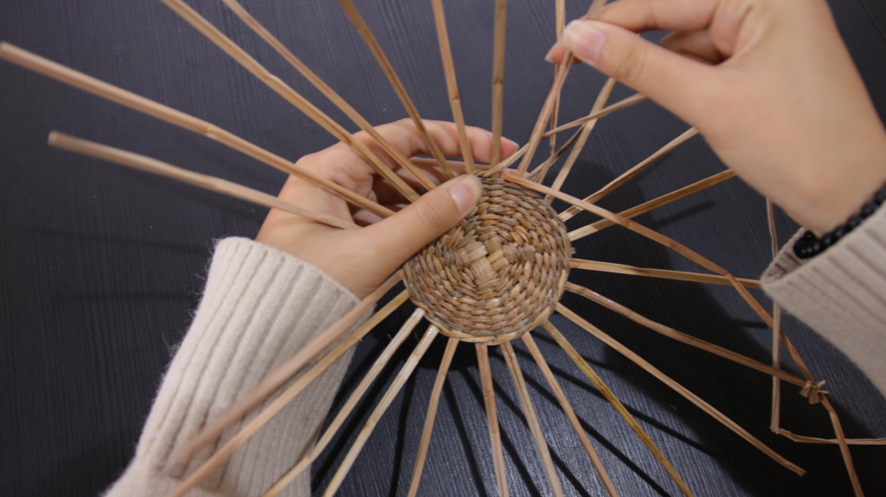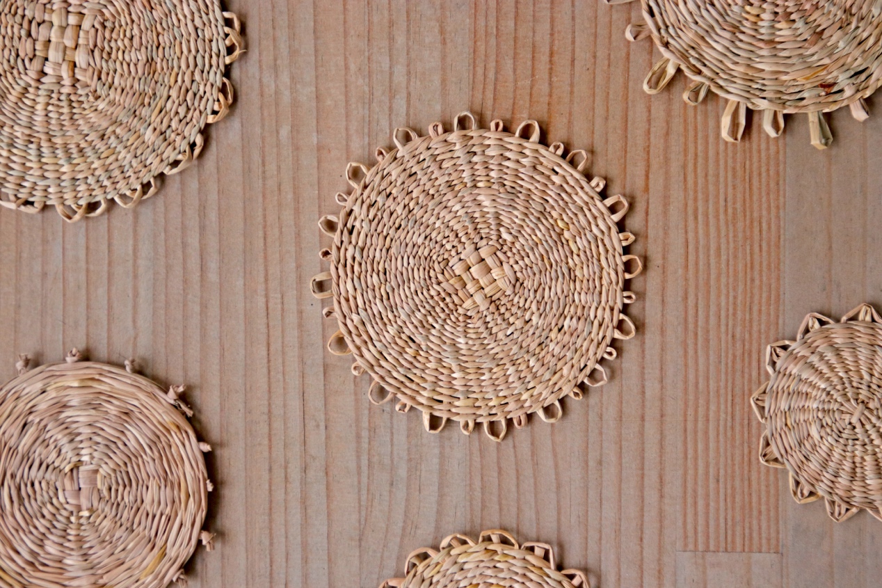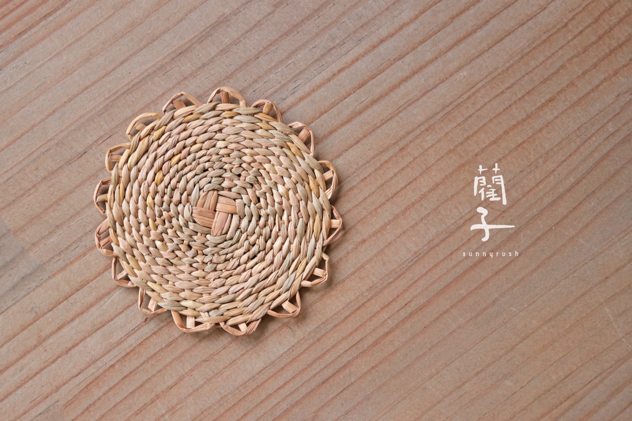 這次體驗教大家完成圓形杯墊,「圓形杯墊」主要會使用「絞編」技法,先以12支草為底固定成支架,再使用兩股草交錯絞纏在12支架上,依序編織出圓形的杯墊,在淡淡的藺草香中往返重複繞出屬於自己的手路紋樣,體驗自然悠閒的編織韻律。