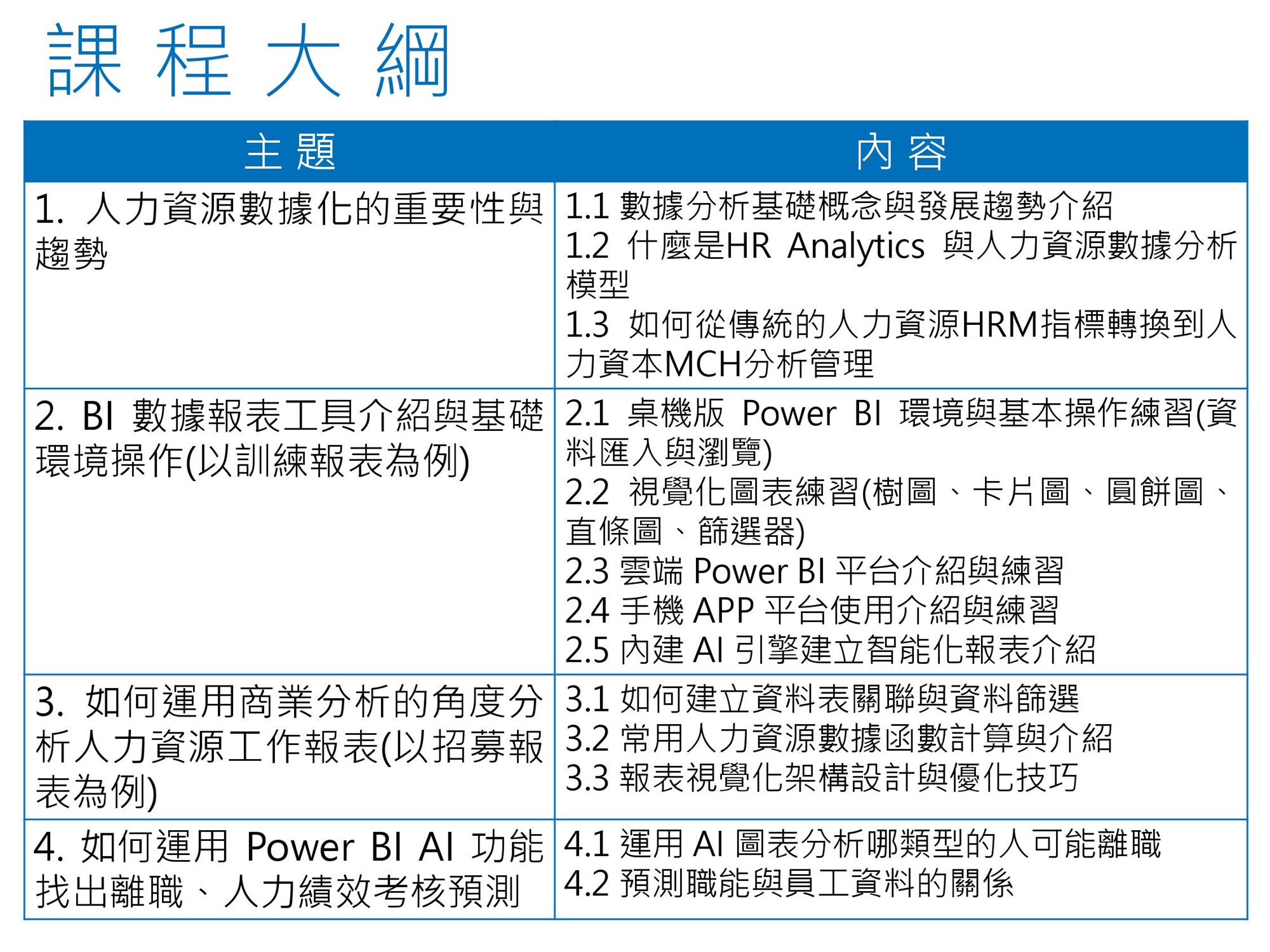 透過 Power BI ,讓你更深入地解讀資料、提升個人數據分析力,進而在HR職務上,快速從一堆數據資料中挖掘出有意義的資訊,制定出人力資源指標,並短時間內做出視覺效果絕佳的出色分析報表。另外你可以利用 Power BI AI 功能做出績效考核與離職的預測。這將使你的職涯創造出跟其他人截然不同的高度、深度跟價值,讓你的老闆、同事對你刮目相看。