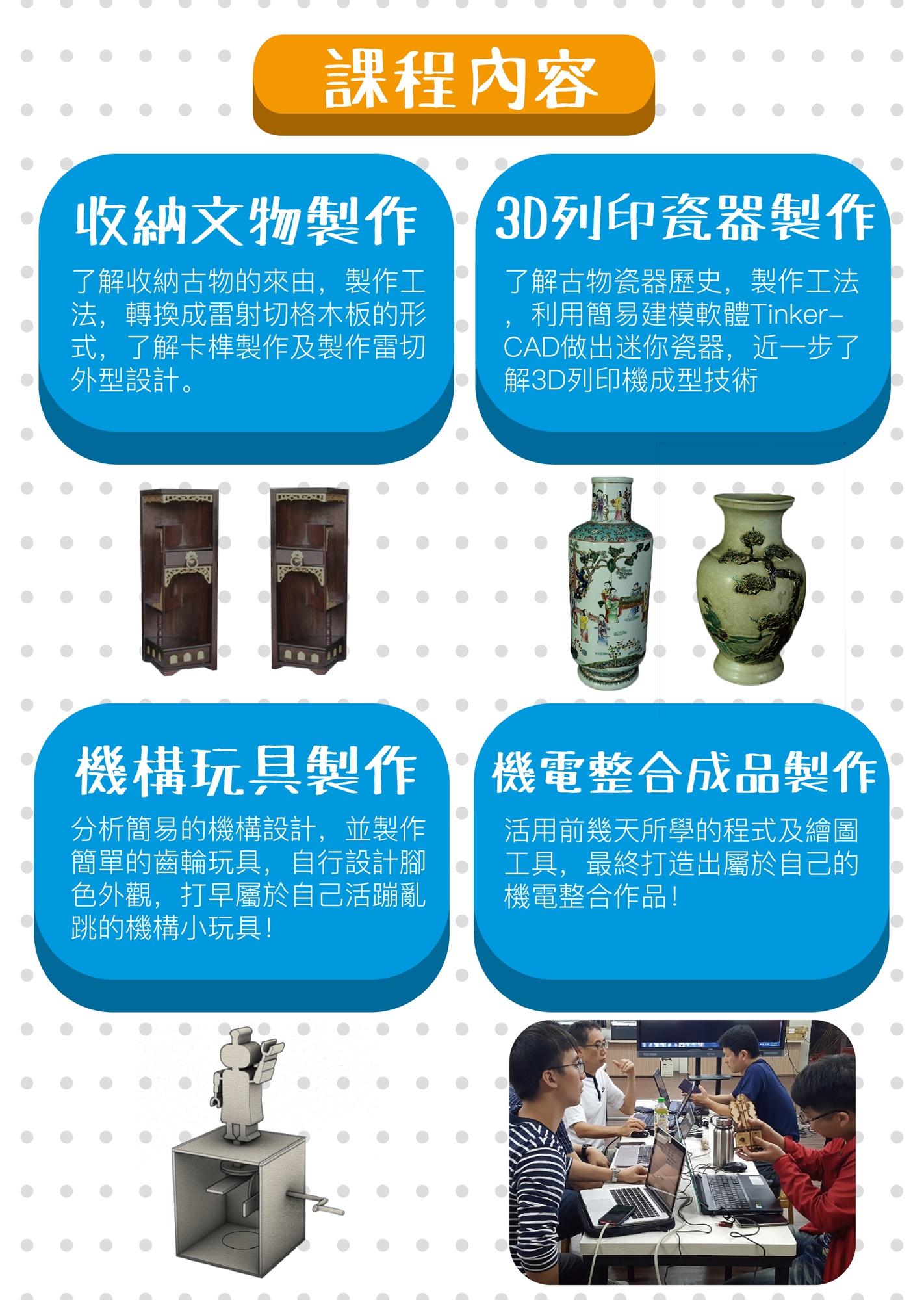 國小四年級~國中一年級 有興趣 古文物或創客的小朋友,可以學習到如何用創客的角度去了解古文物