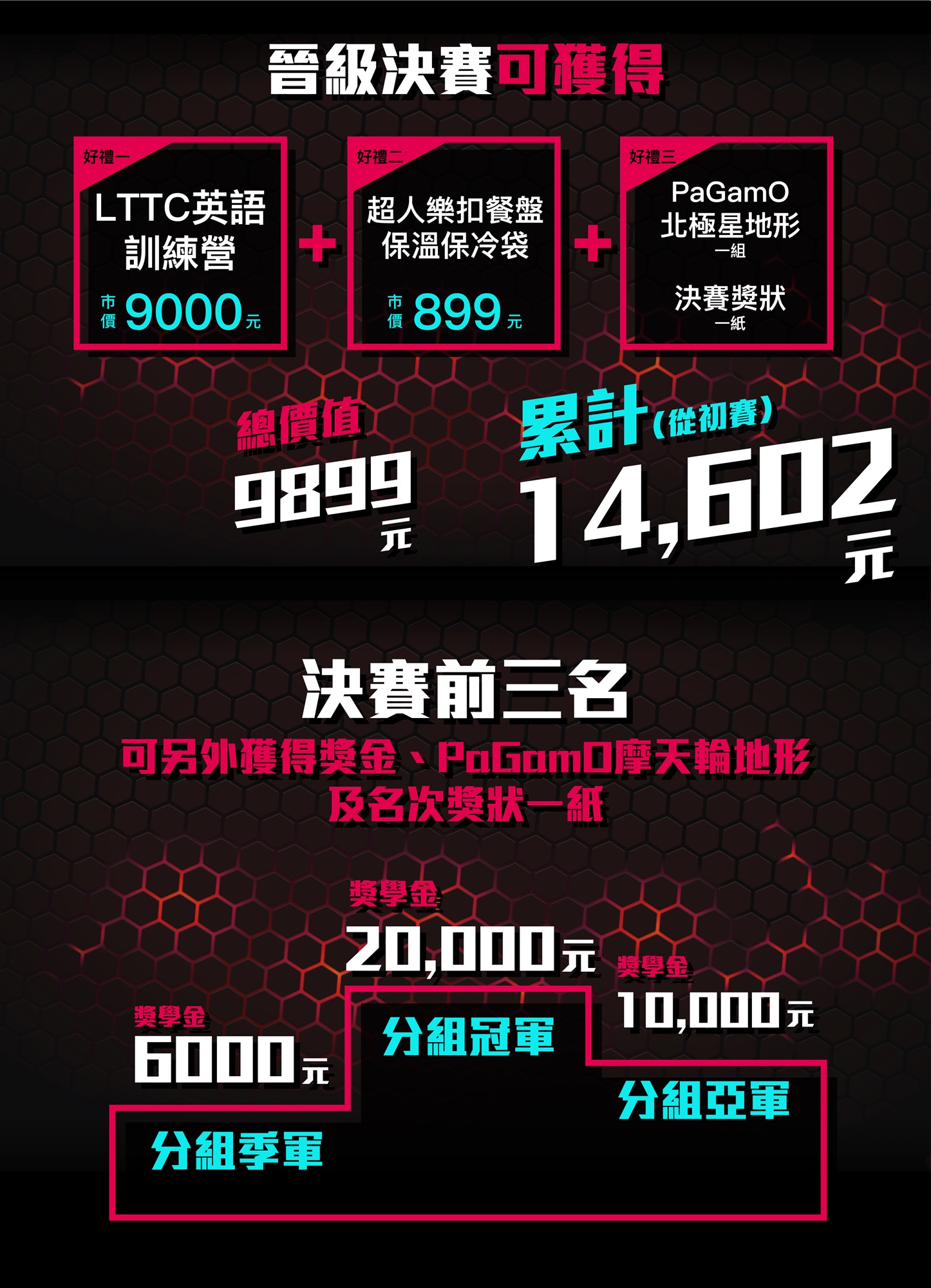 5.線上初賽、現場複賽與準決賽將以PaGamO電競系統進行,報名時請登入或註冊PaGamO帳號。