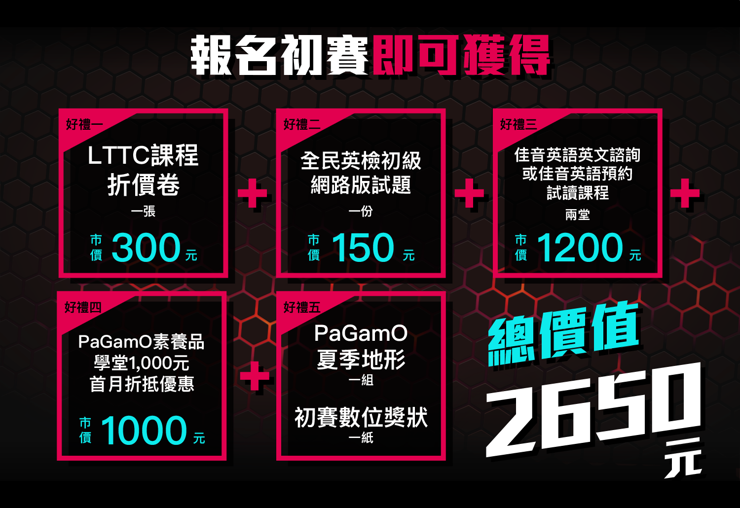 全球第一線上學習遊戲『PaGamO』與『語言訓練測驗中心(LTTC)』、『佳音英語』聯手出擊,打造史無前有的英文競賽。透過專業的賽制規劃與精準命題,結合熱血的電競遊戲以及現場英語溝通力比賽,有系統的將單字、聽力、閱讀、寫作與口說能力,融入於本賽事之中。賽事過程中,除體驗刺激的電競遊戲,晉級者還有機會參與由LTTC打造的「英語培訓營」暨英語溝通能力競賽,讓賽事同時兼具遊戲競爭、英語鑑測、能力培訓、口語表達等多元特色。