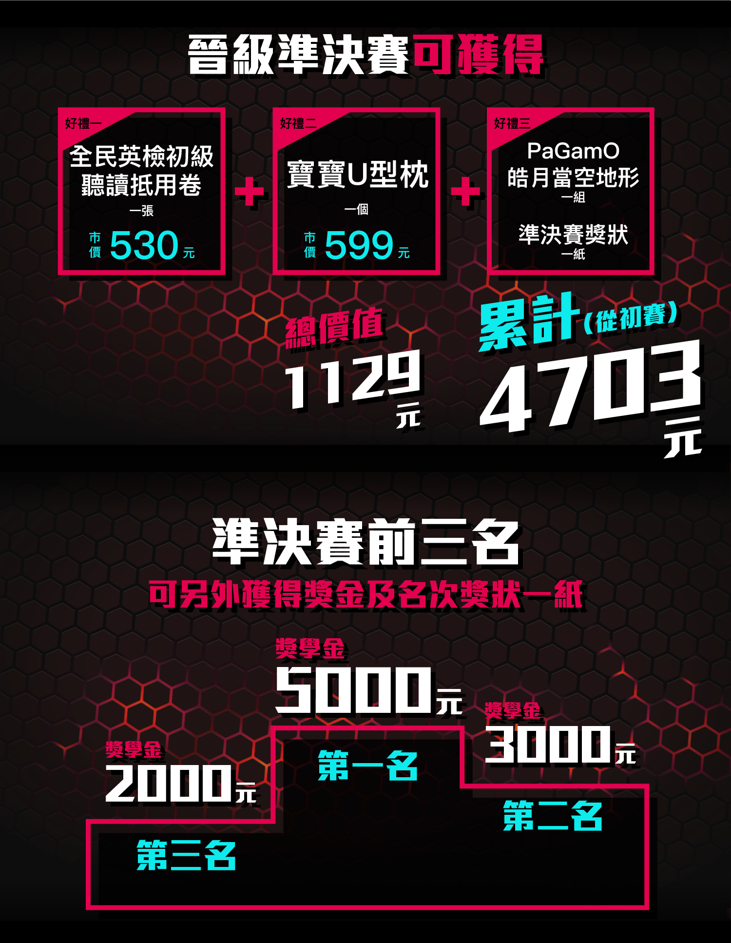 準決賽季軍:另獲得新台幣貳仟元獎學金、準決賽季軍獎狀一紙。