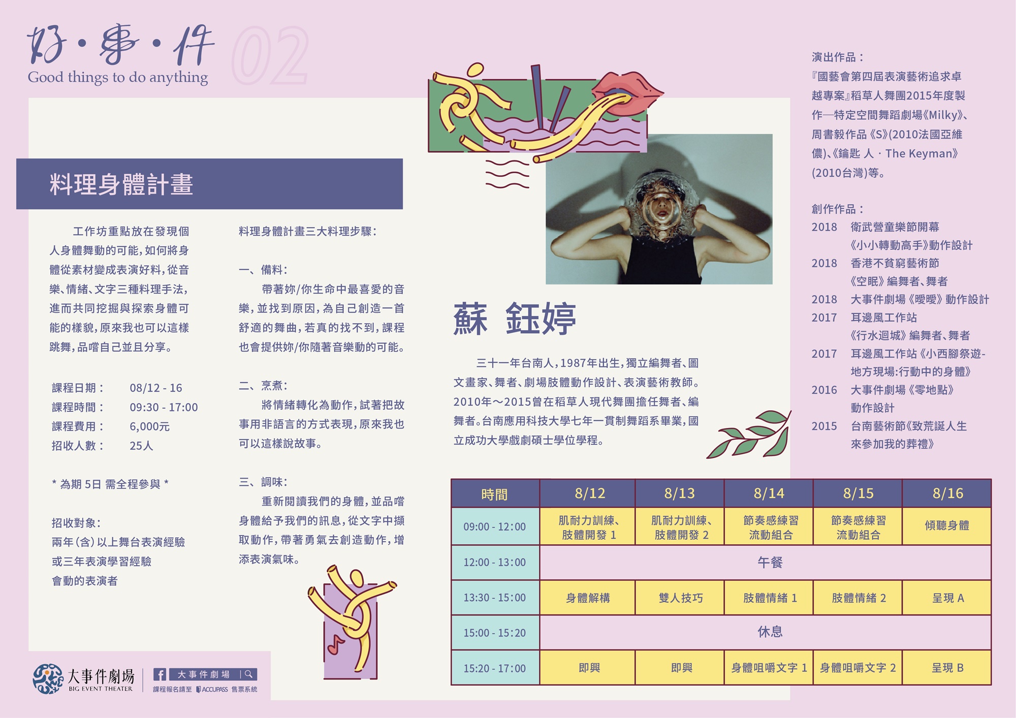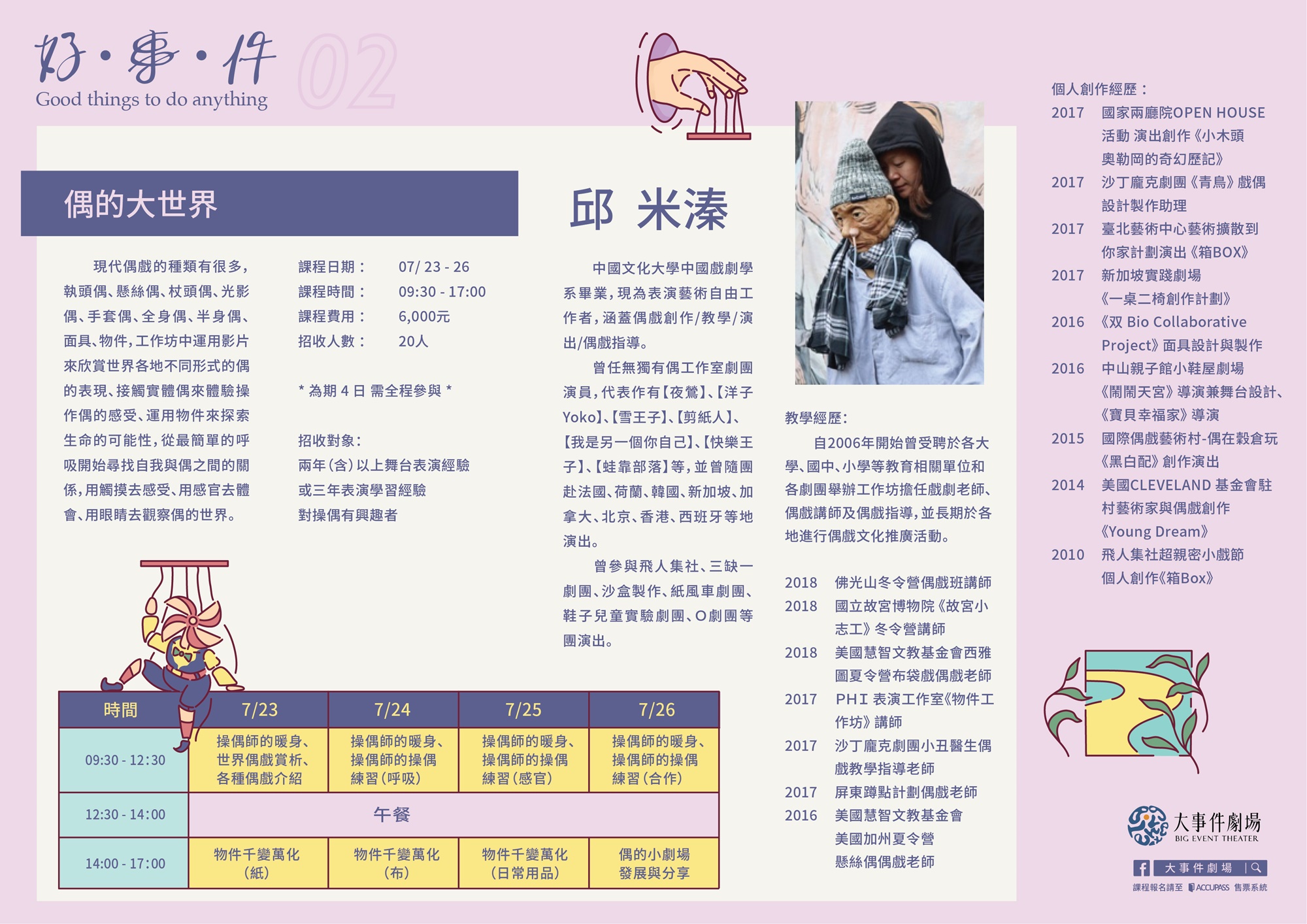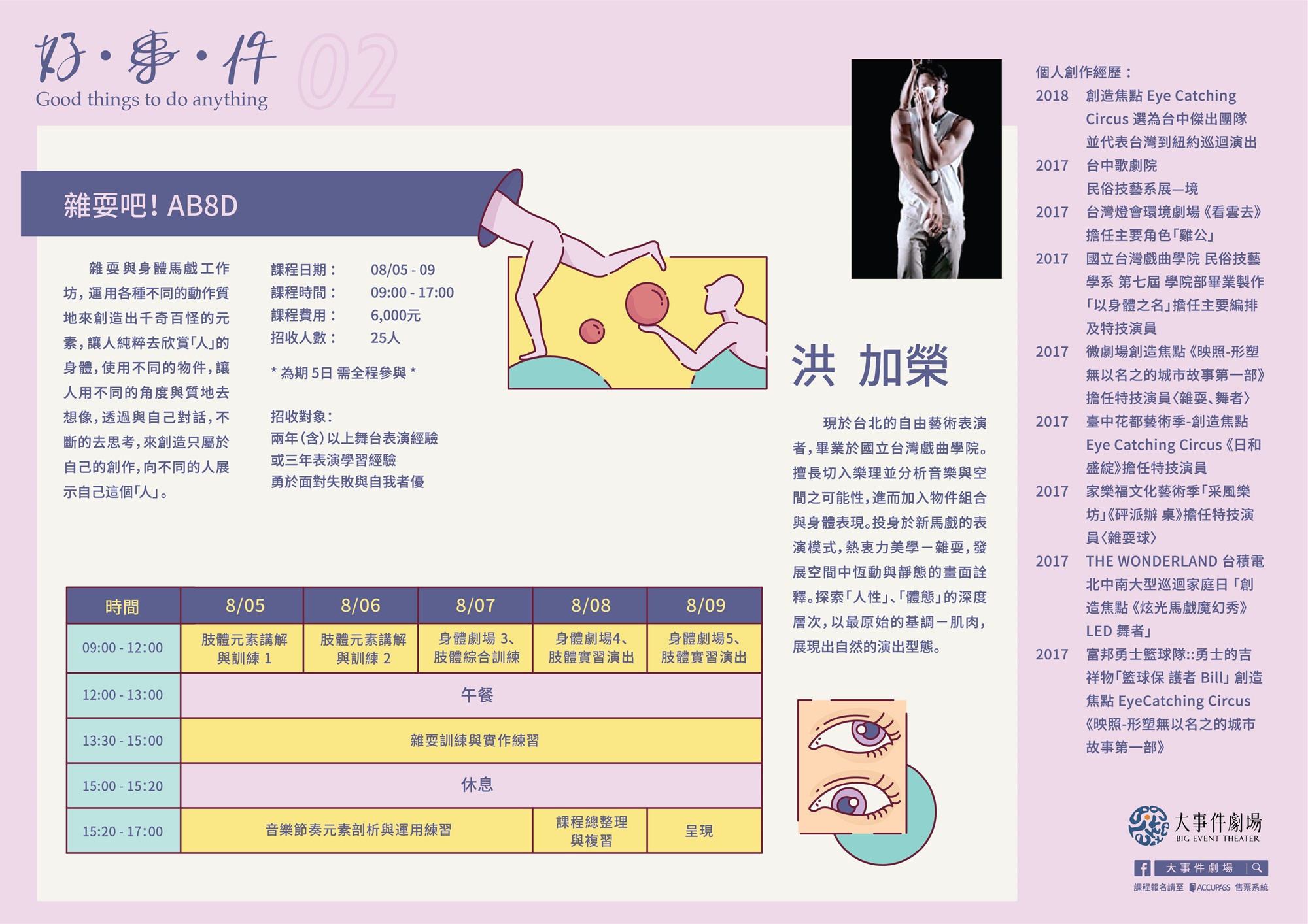 D.「偶的大世界」、「雜耍吧!AB8D」、「料理身體計畫」課程,招生對象為二年(含)以上舞台表演經驗 或 三年表演學習經驗 。