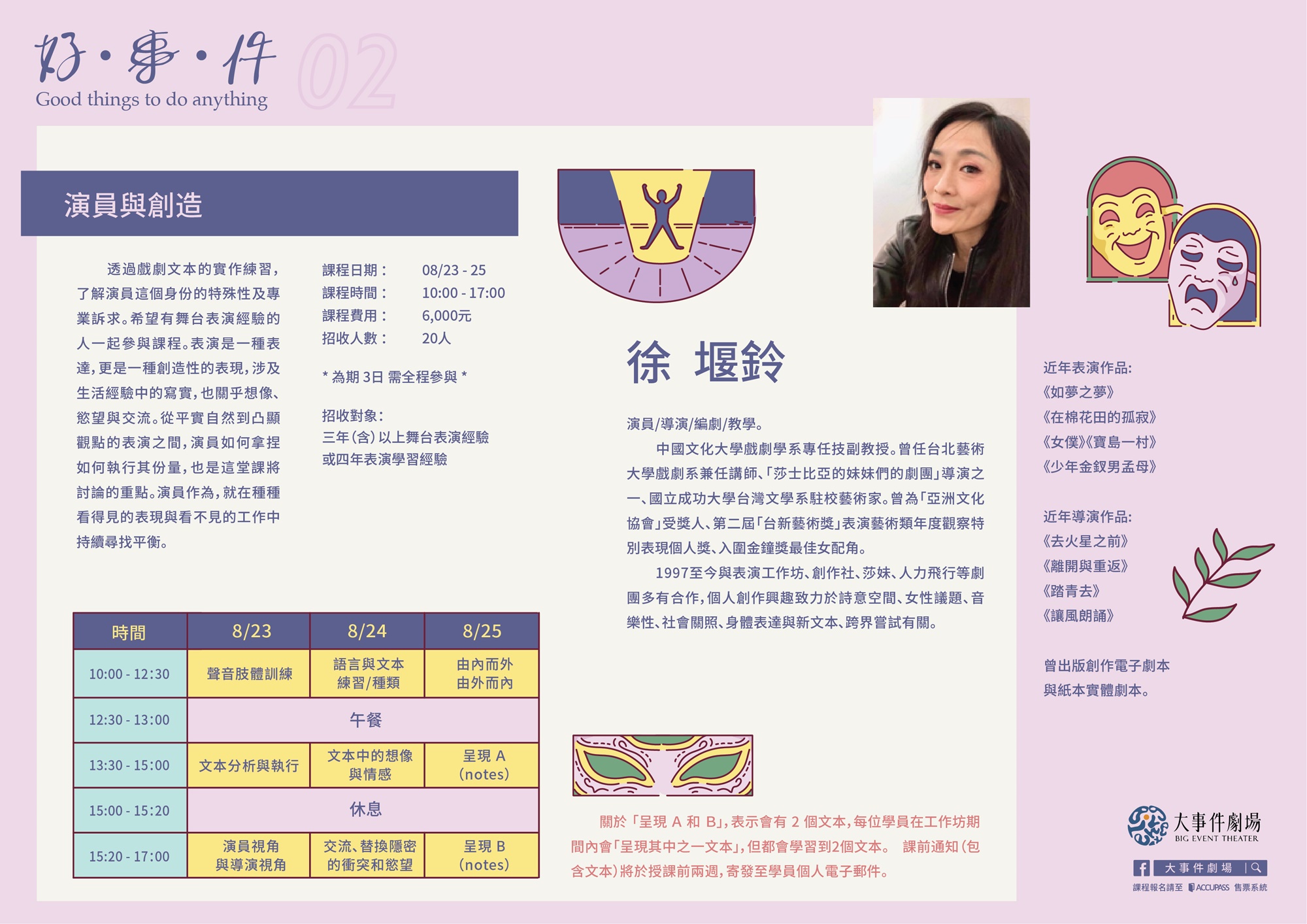 E.「演員與創作」課程招生對象為三年(含)以上舞台表演經驗 或 四年表演學習經驗 ,請學員於2019年6月30日前填妥報名資料,將統一於2019年7月15日前E-mail回覆學員是否資格審核通過。