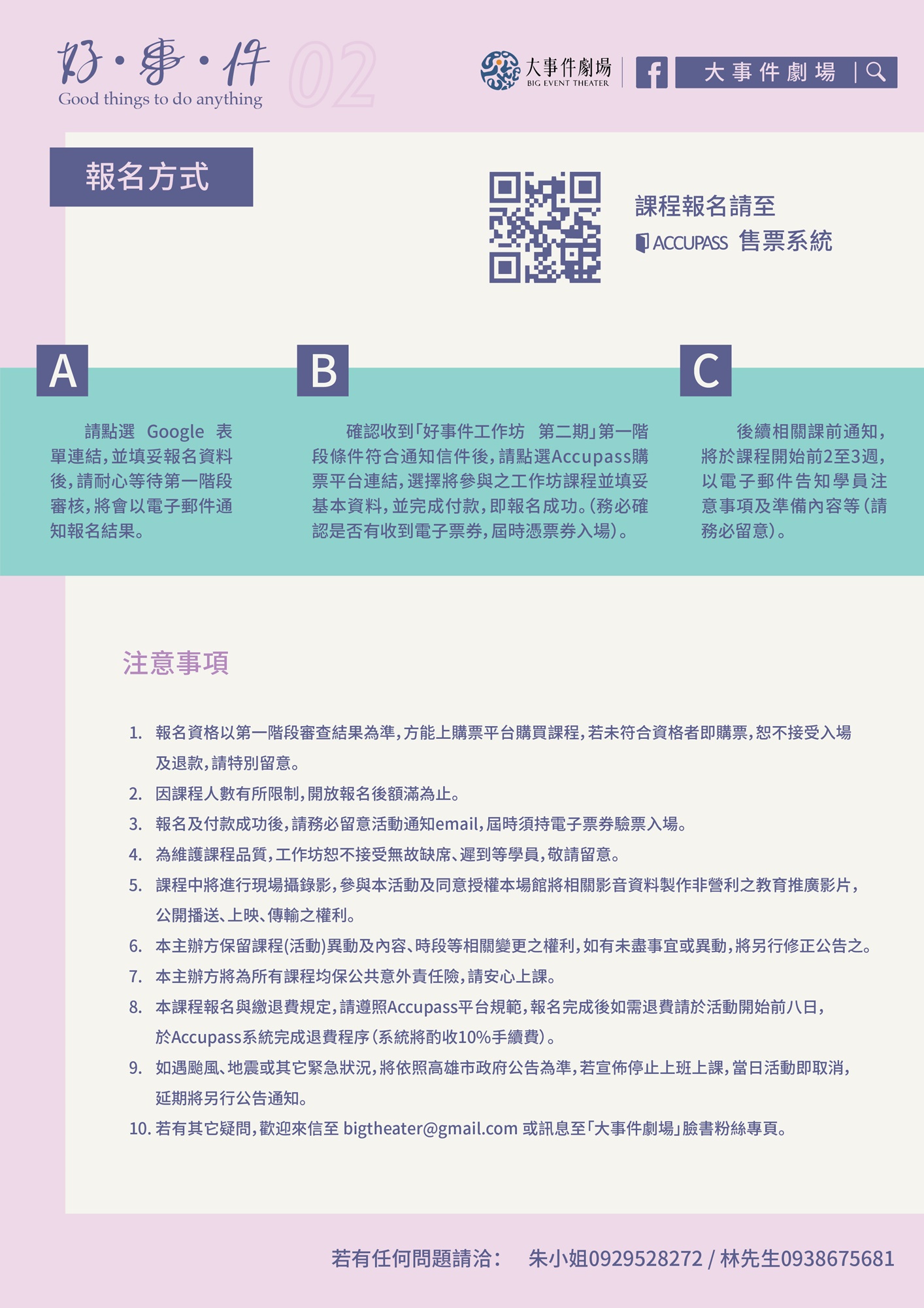 B. 確認收到「好事件工作坊 第二期」第一階段條件符合通知信件後,請點選Accupass購票平台連結,選擇將參與之工作坊課程並填妥基本資料,並完成付款,即報名成功。(務必確認是否有收到電子票券,屆時憑票券入場)。