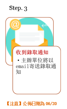 ![]() | ● 收到錄取通知 1. 由於場地規模限制,主辦單位將保留學員篩選權利。 2. 6 月 20 日將以email通知錄取,屆時敬請注意信箱。 |