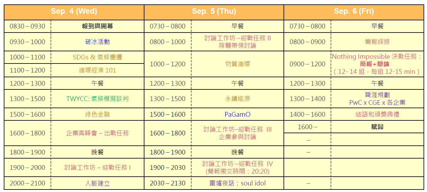 營隊將邀請循環經濟、綠色金融與永續能源業者,傳授永續知識,帶領學員深入淺出學習永續要領;透過青年氣候聯盟(TWYCC)引領氣候模擬談判會議,讓學員體會氣候談判會議上的大國角力;與Pagamo團隊幫你優(Bonio)合作開發獨創的永續電競遊戲,透過刺激的競賽讓學員從做中學;最後還有職涯輔導時段,引領想從事永續工作的學員如何規劃未來…還有更多更多你意想不到的收穫,期待螢幕前的你能一起共襄盛舉!