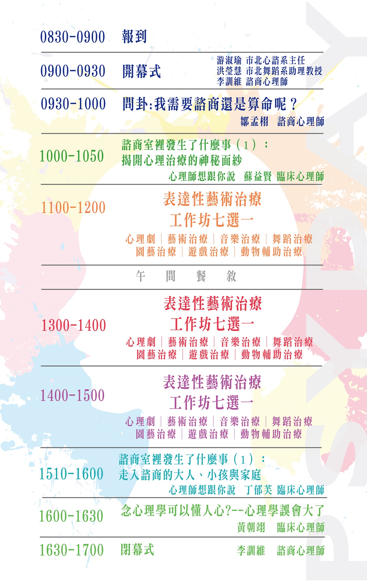 在表達性藝術治療體驗之餘,4場由實務經驗豐富的心理師,用平易近人的方式,分享心理學與生活的連結,讓你驚呼生活處處能啟動改變。