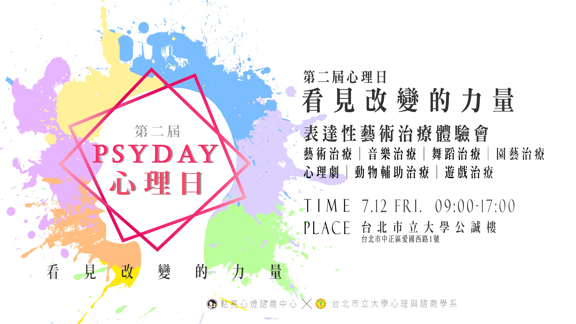 大家好,還記得PSY(ㄙㄞ`) DAY 心理日嗎? 繼2017年第一屆心理日後,2019年再次回歸的心理日,要給你滿滿的表達性藝術治療體驗!