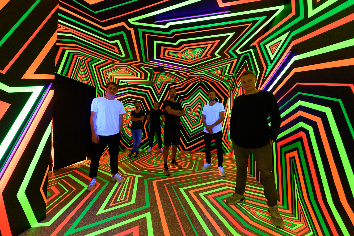 「膠光幻影」是藝術家以RGB三原色為概念打造出的夜視長廊,利用鮮豔大膽的紅、綠、藍等霓虹線條包覆空間,在燈光錯落亮起的同時,膠帶會因應光源而產生千變萬化,強烈衝擊視覺感官。