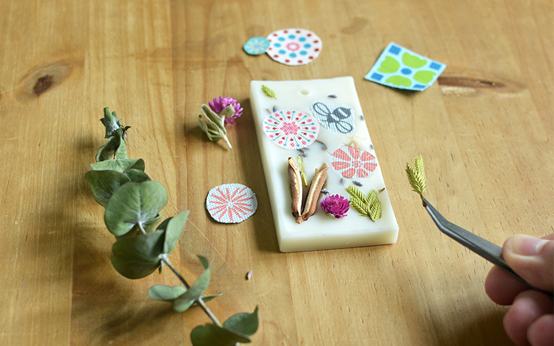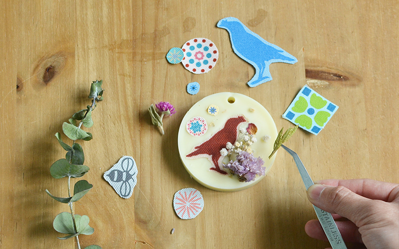 與印花樂的聯名課程,特別加入印花樂布塊,搭配乾燥花材,完成獨具風格的香氛配件。