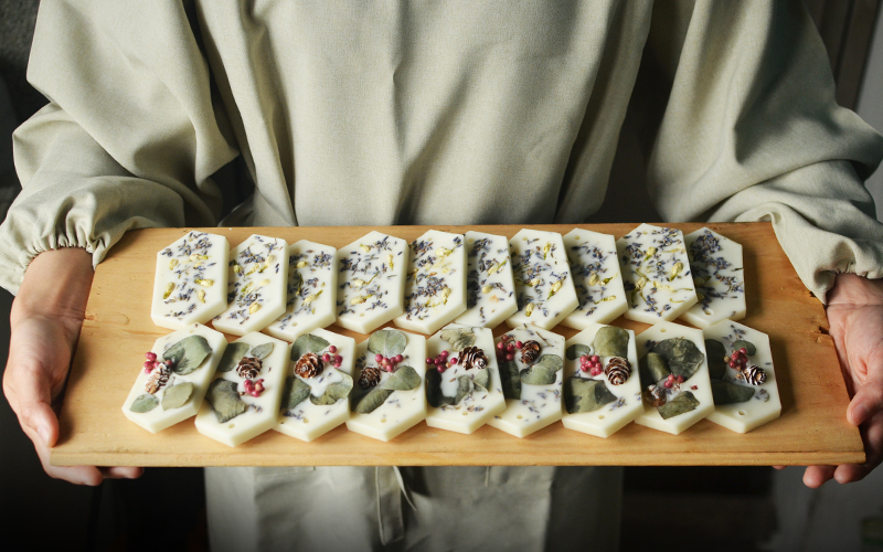 透過手工皂、凝香蠟片凝結自然風景,進入你的生活裡。使用植物油、精油、蜂蠟、藥草、礦物泥製作成美麗的香氣手工皂、芳香物件,成為日常生活中的一隅小風景,療癒身體、也療癒了心情!