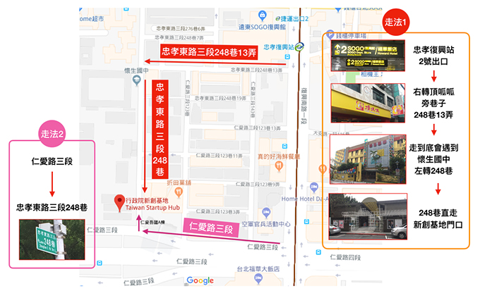 地點:台北市大安區仁愛路三段99號,捷運忠孝復興站,行政院新創基地(路線如下圖)